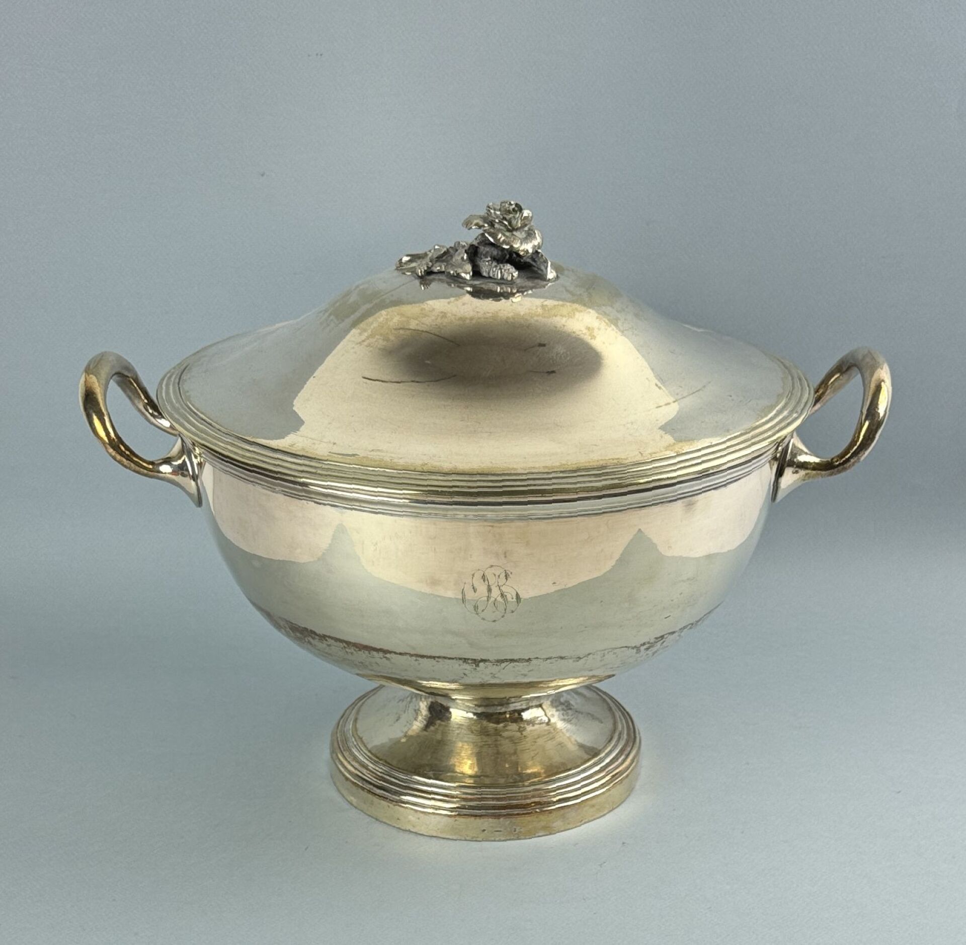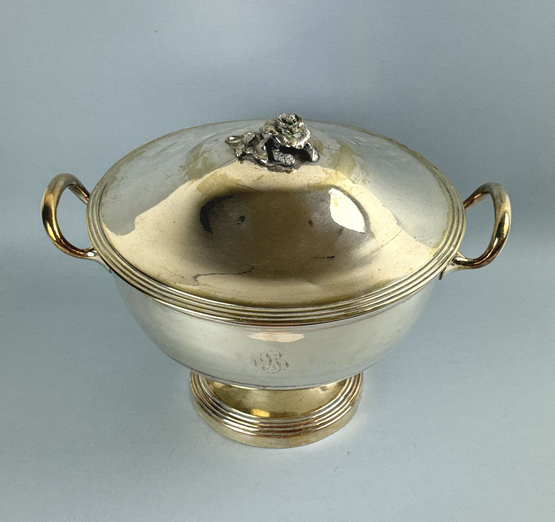 Importante coupe couverte sur piédouche en métal argenté à décor de filets, le frétel figurant une branche fleurie, gravée sur le corps « OSG »