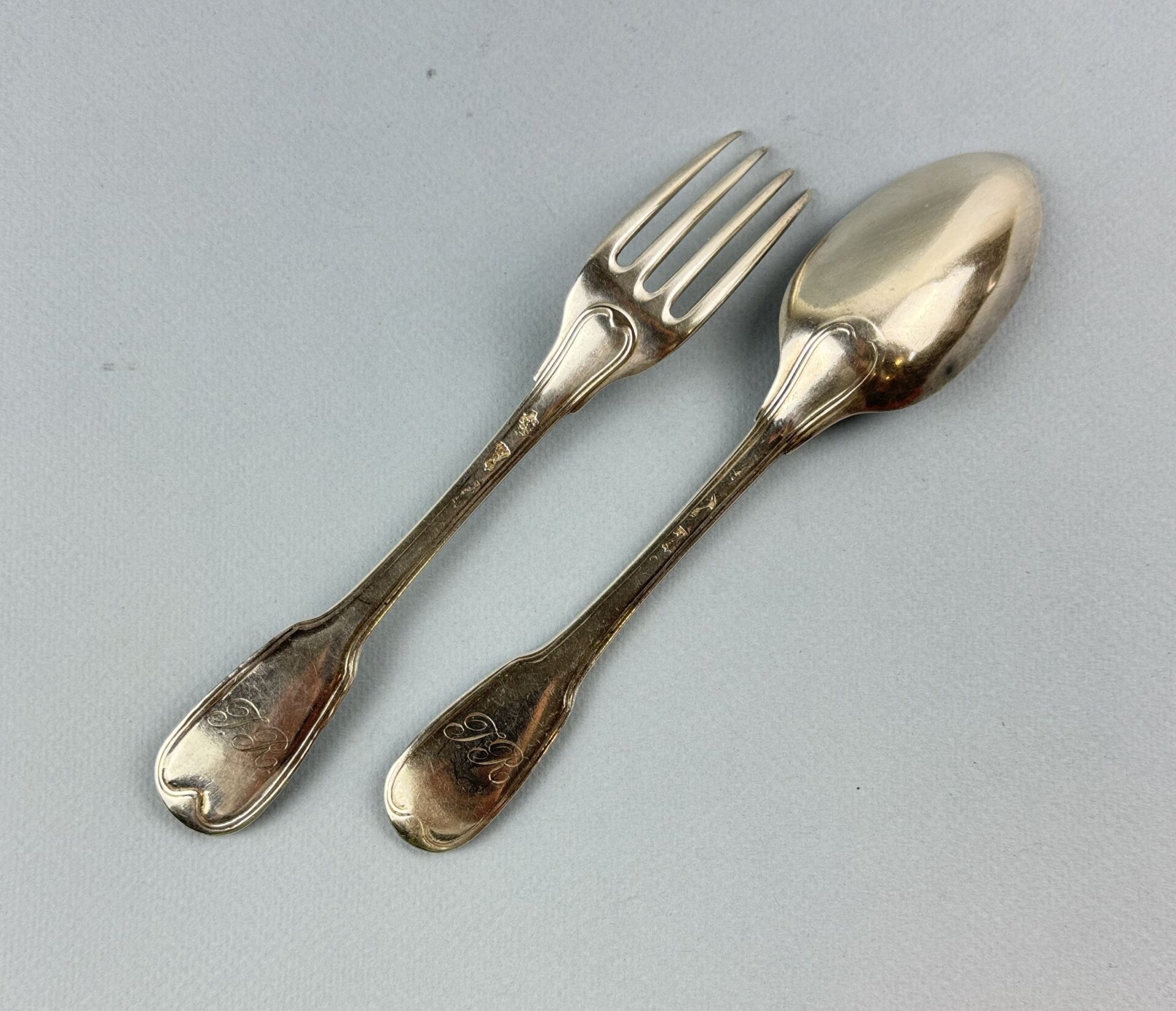 6 RÉSULTAT: 140 € ESTIMATION: 80 / 120 € Une fourchette et une cuillère en argent modèle filet, chiffré « TR » Paris, XVIII° L’une du Maître Orfèvre : Pierre Nicolas SOMMÉ, reçu en 1760 Poids : 164 g.