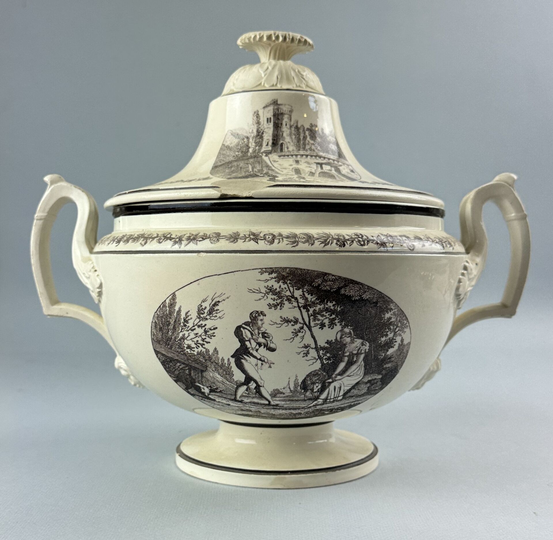Soupière en faïence blanche à décor historié de scènes à l’Antique sur le thème de l’amour, deux grandes anses terminées par des feuilles d’acanthe et têtes de faune