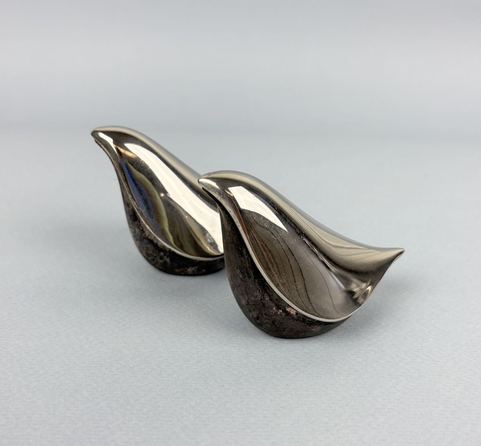 247 ESTIMATION: 60 / 80 € Paire de salerons en bois et argent figurant des oiseaux stylisés Salissures sur le bois H : 6.2 cm Poids brut : 132 g