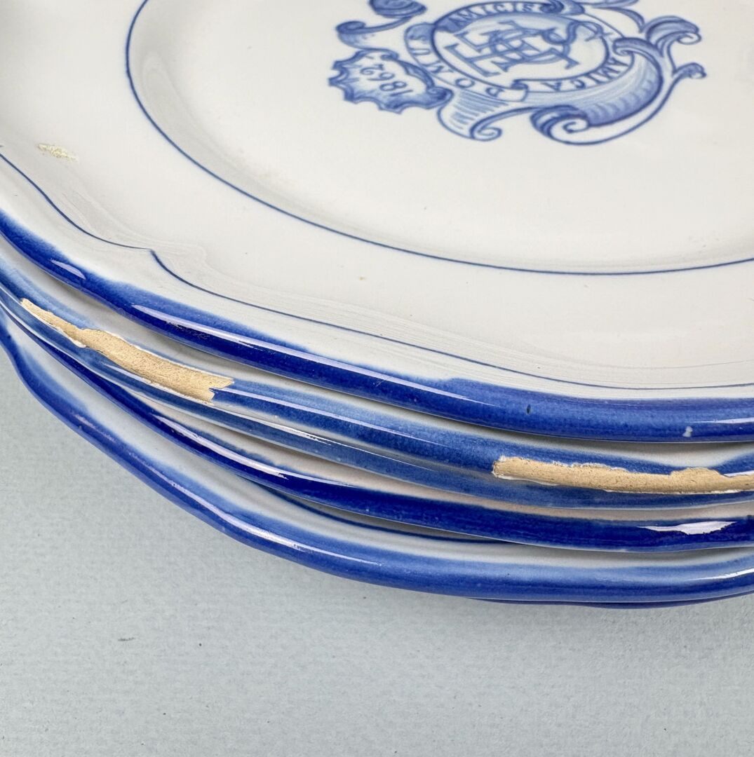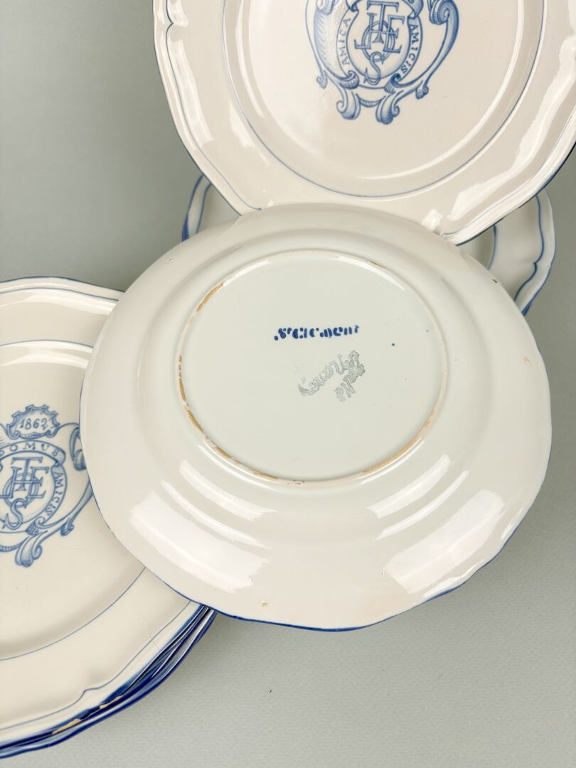Suite de onze assiettes en faïence à bords chantournés à décor de blason chiffré, marqués de la devise « Amica Docums Amicis » et datées 1862