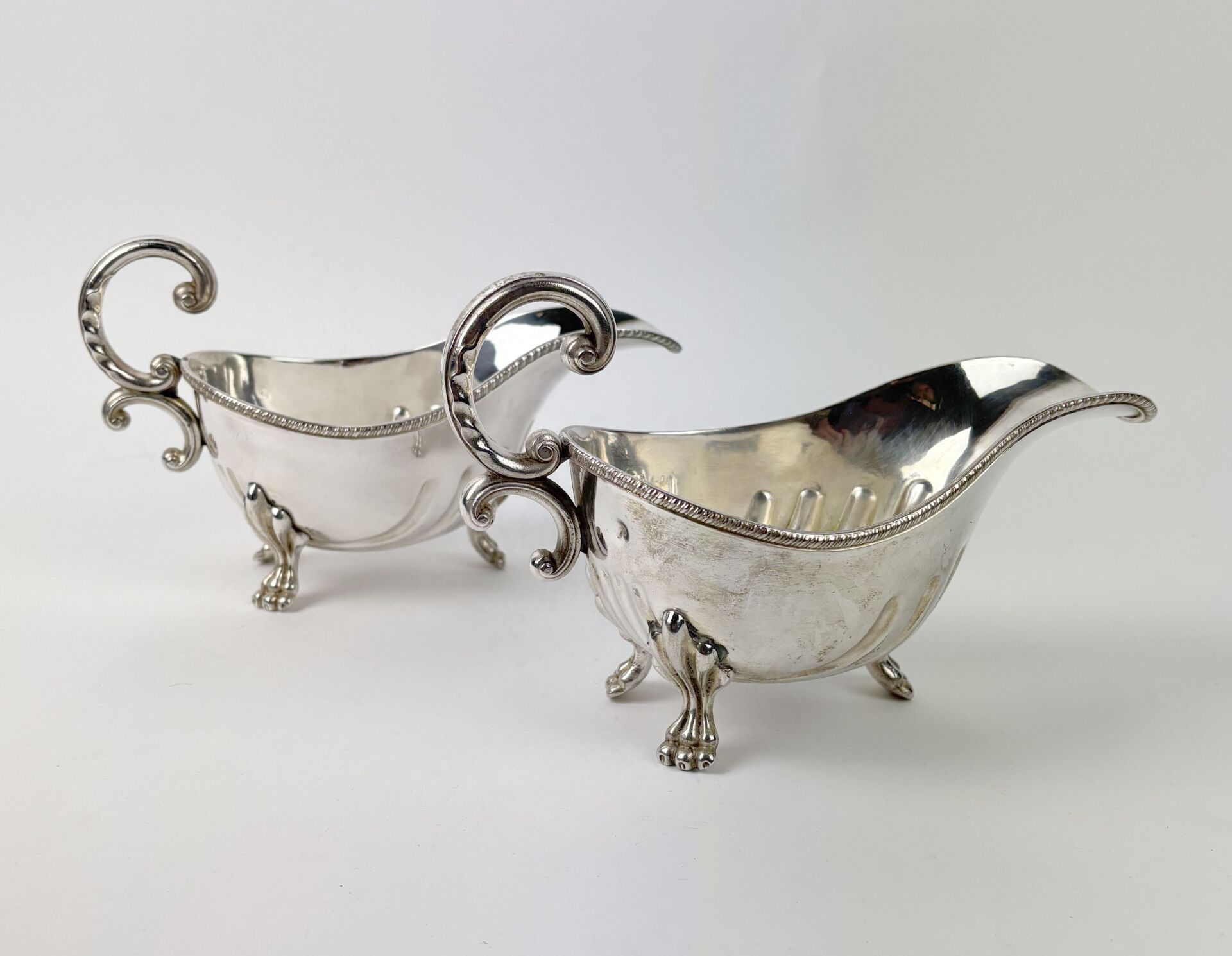 325 ESTIMATION: 30 / 50 € Paire de saucières de service en métal argenté reposant sur un piètement tripode se terminant par des pattes léonines.