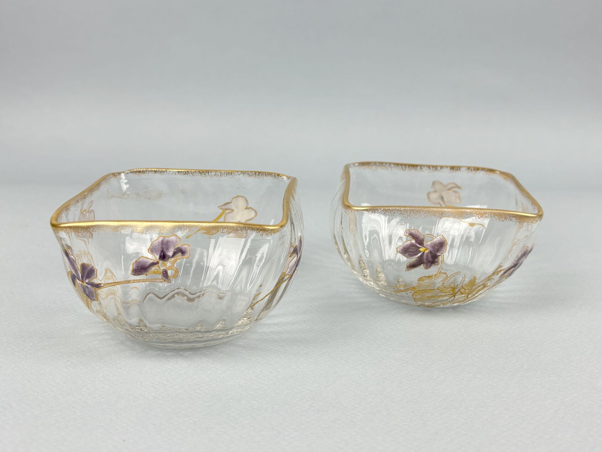330 ESTIMATION: 40 / 60 € DAUM, dans le gout de Deux rince doigts en verre à décor émaillé de violettes, bordure dorée à l’éponge Travail vers 1900 D : 10 cm