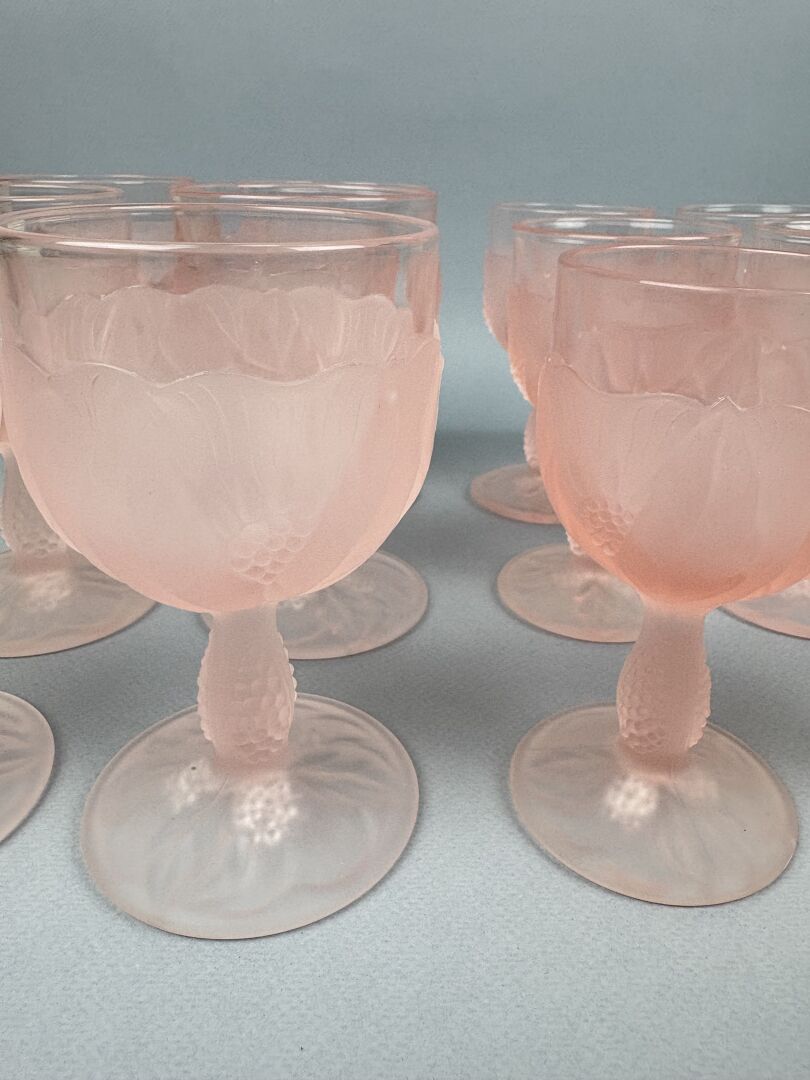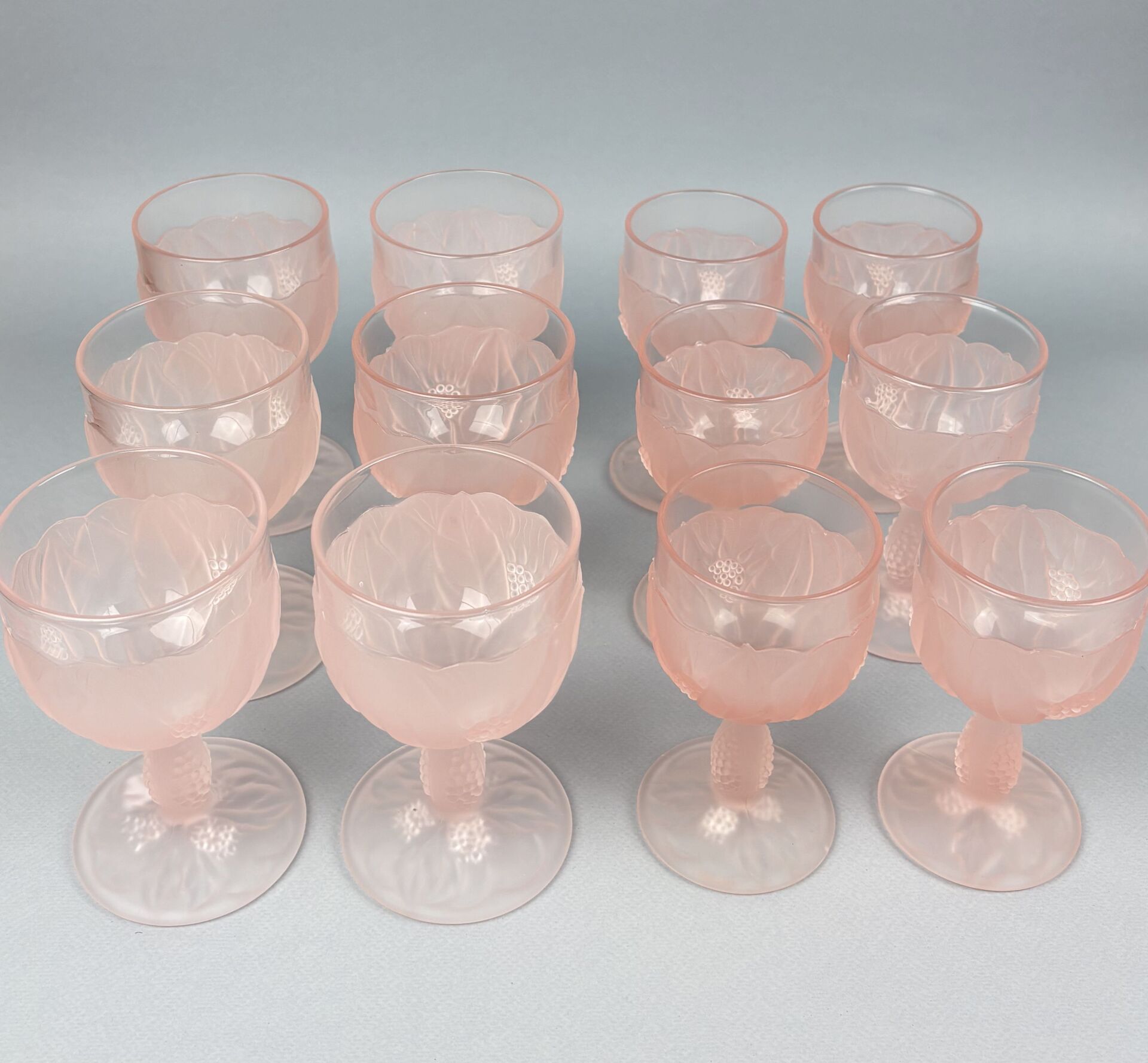 337 ESTIMATION: 40 / 60 € CHAUMETTE, Attribué à Suite de six verres à eau et six verres à vin en verre partiellement dépoli rose à décor de fleurs et feuilles H : 13 et 13.5 cm