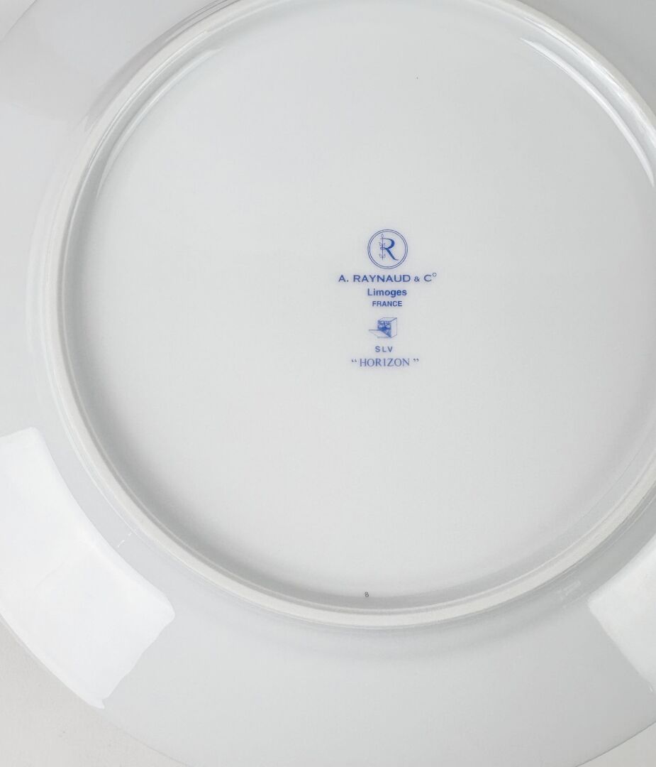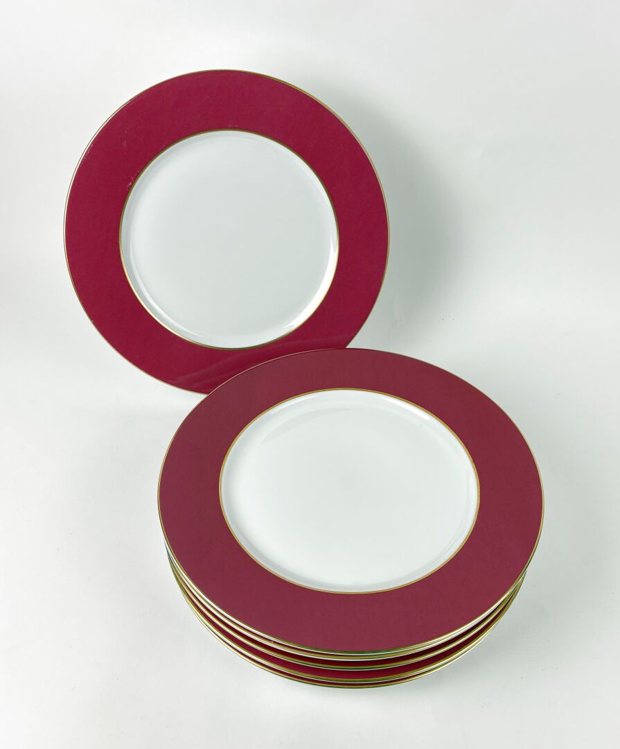338 ESTIMATION: 30 / 50 € RAYNAUD, Limoges Modèle Horizon – Suite de six assiettes de présentation en porcelaine à large marli couleur framboise surligné par deux liserés dorés. Usures D : 30.5 cm