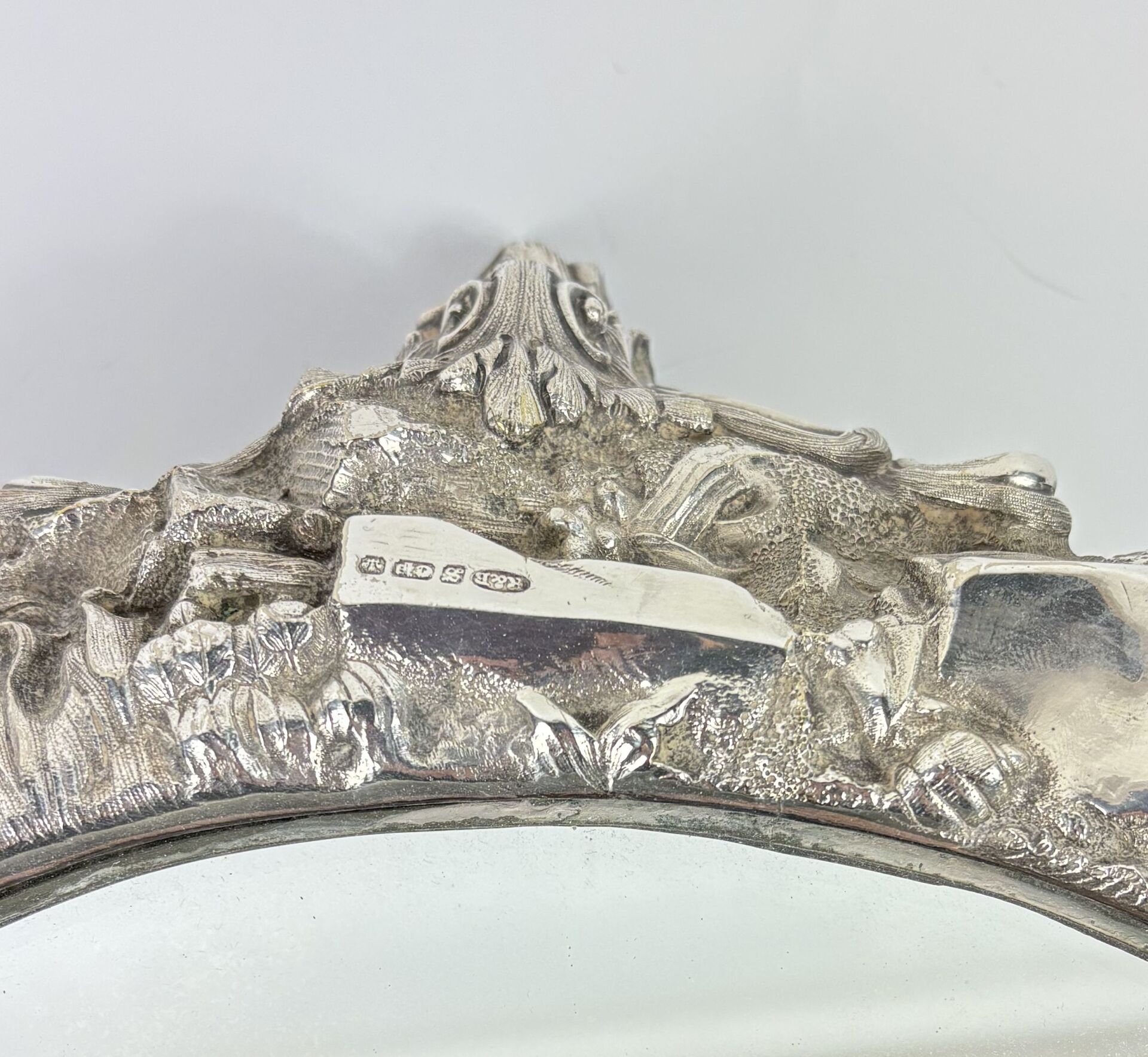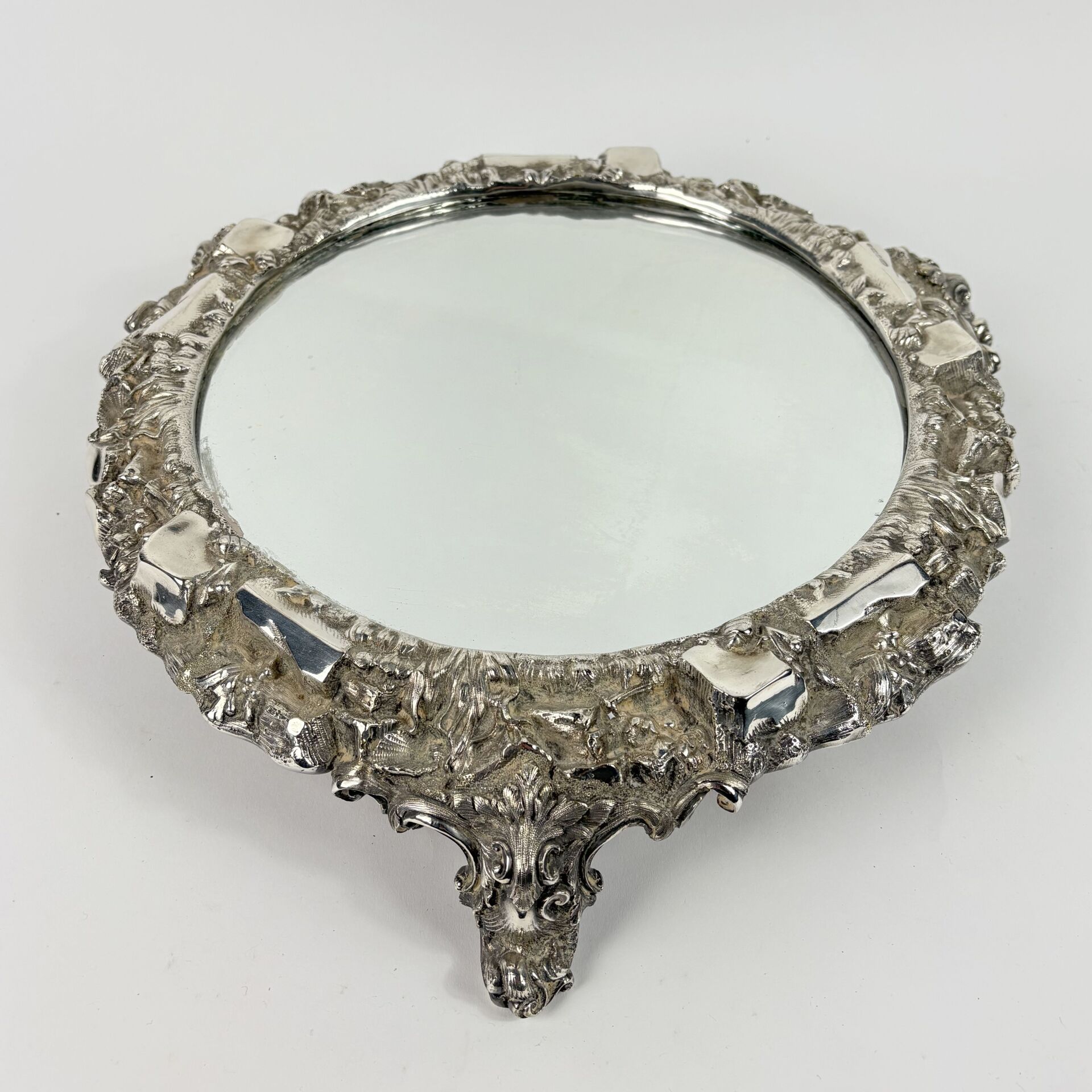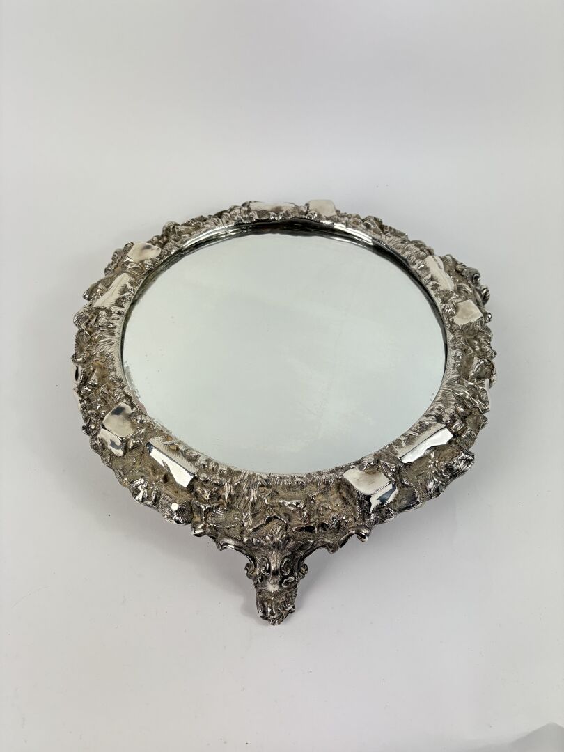 Important centre de table en métal argenté à fond de miroir à décor naturaliste d’enrochements, algues et coquilles reposant sur trois pieds à décor de rinceaux, fond et charnières d’origine.