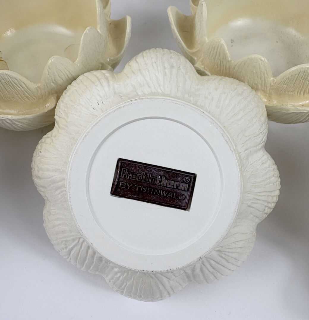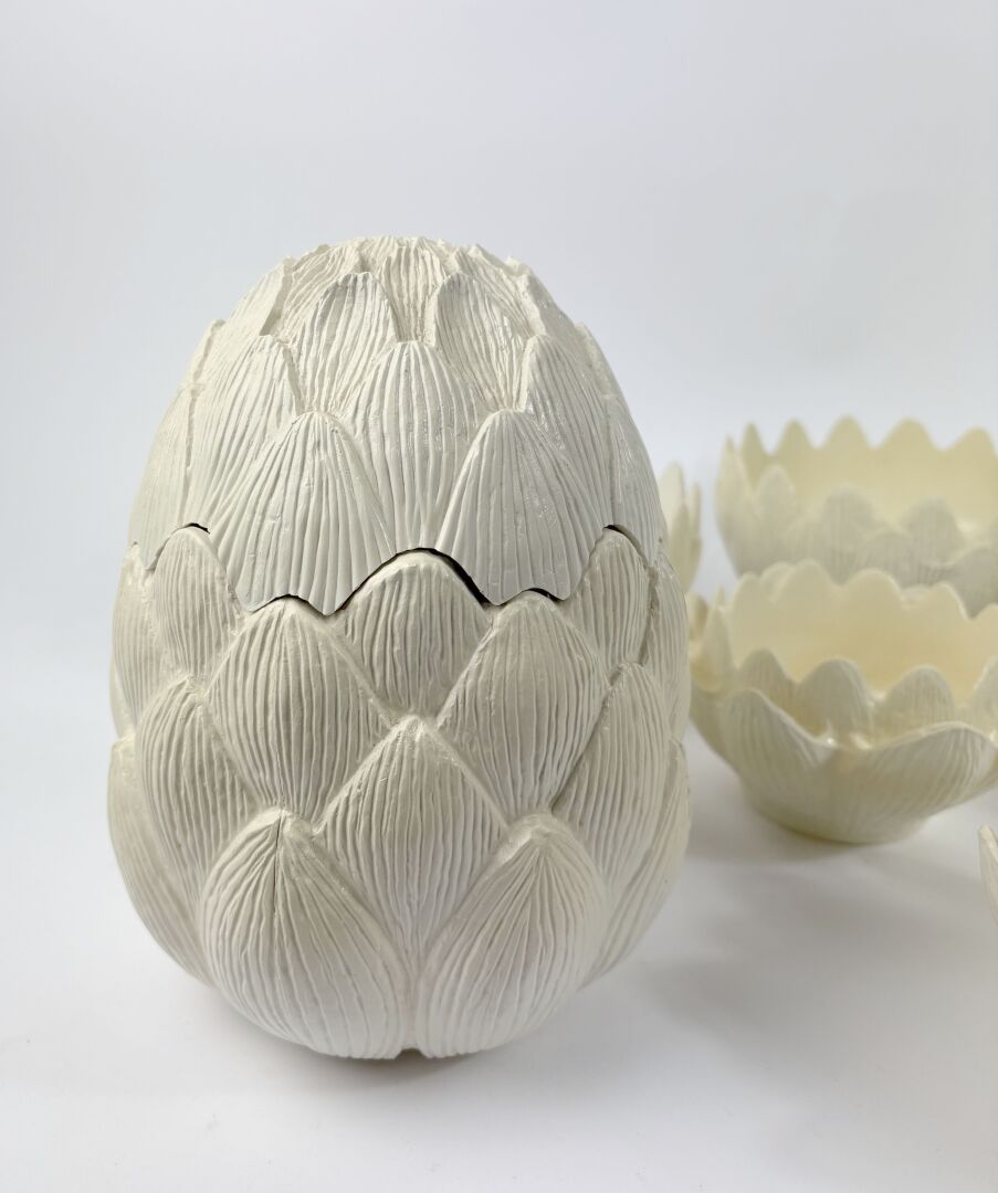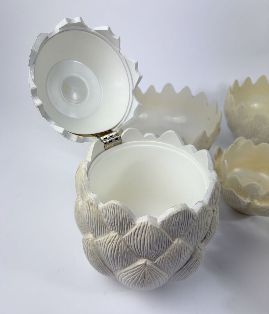 Service à artichauts en résine comprenant deux petits saladiers, une poubelle de table, et six ramequins