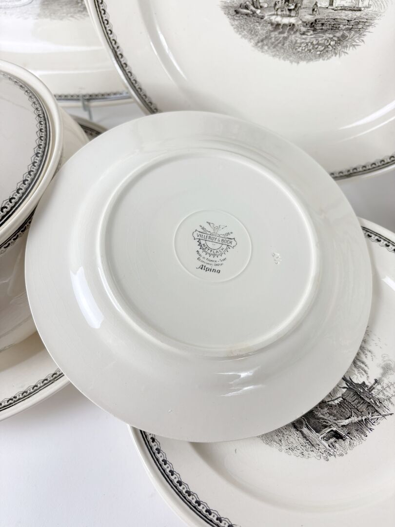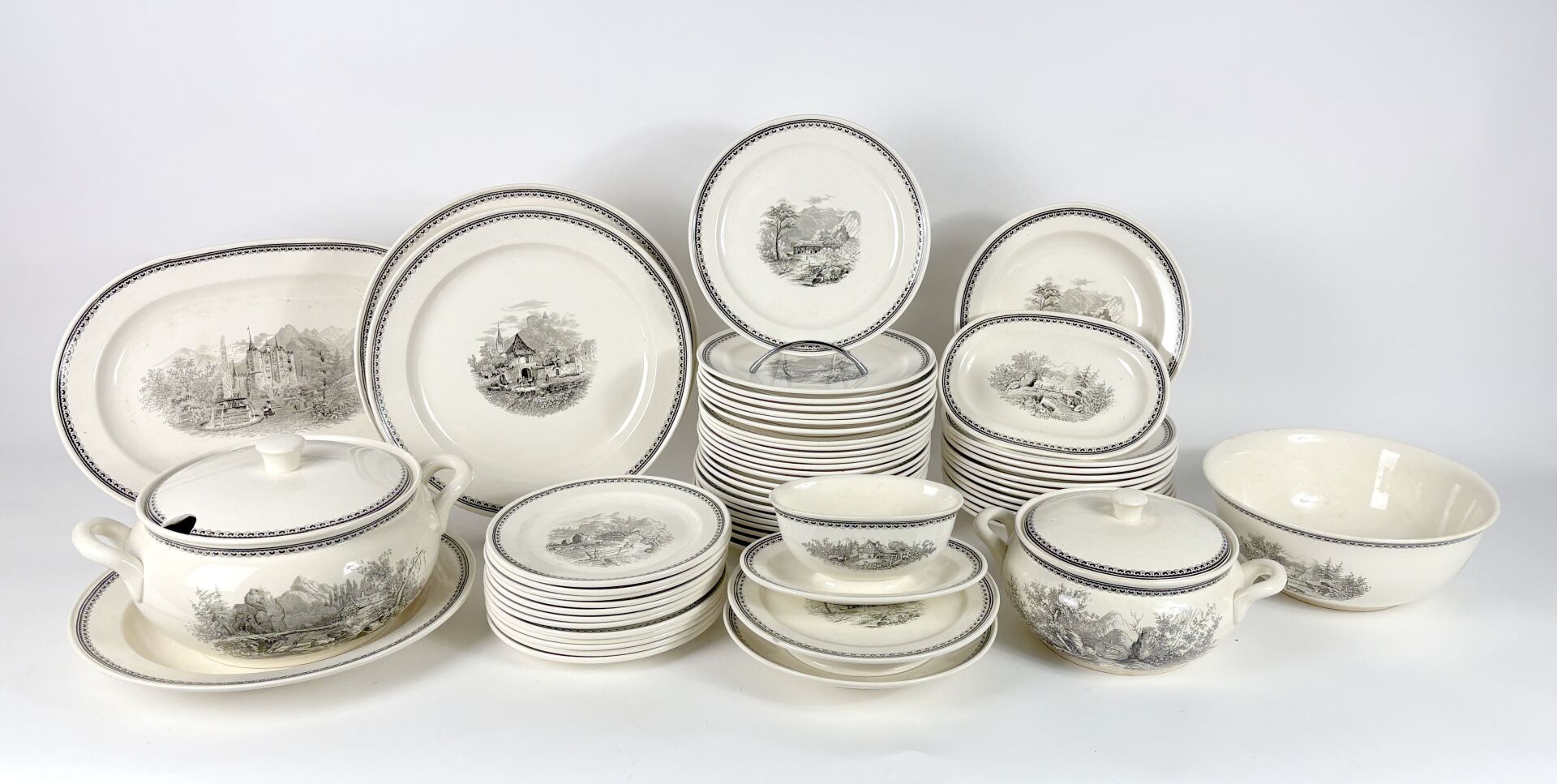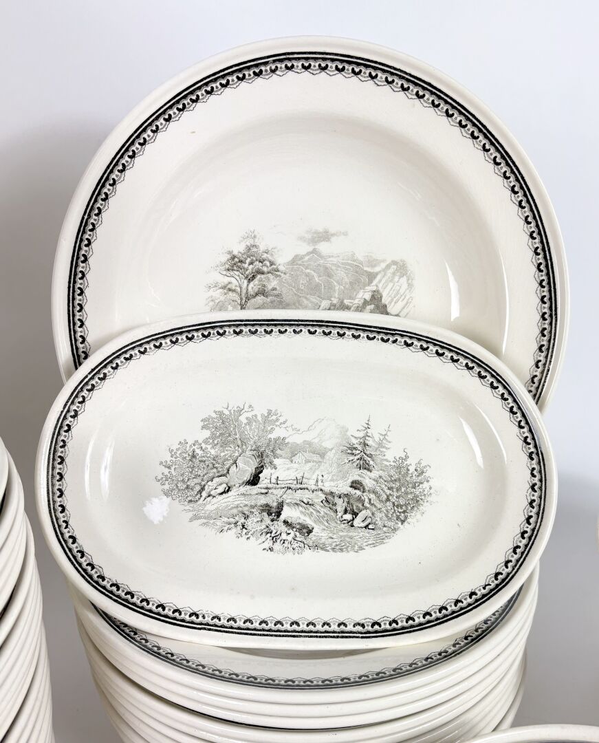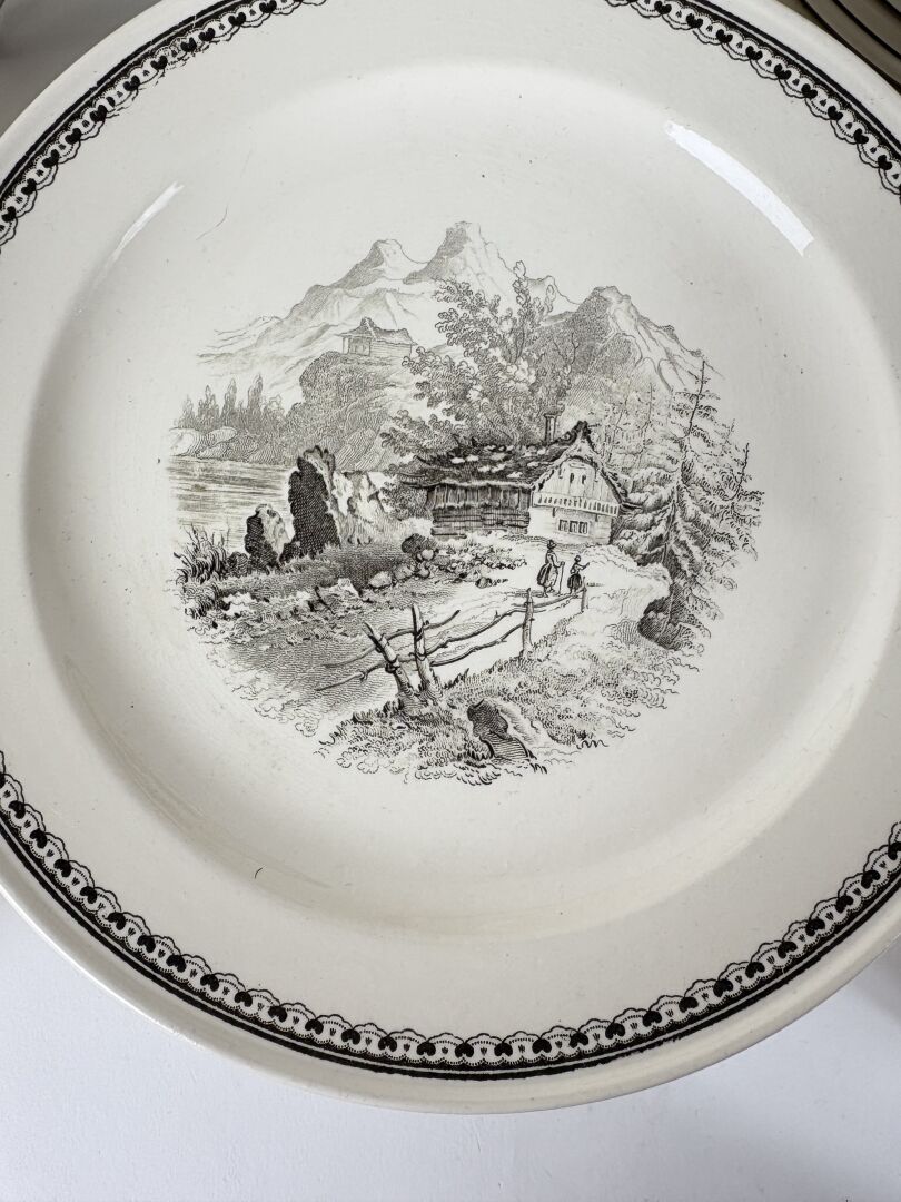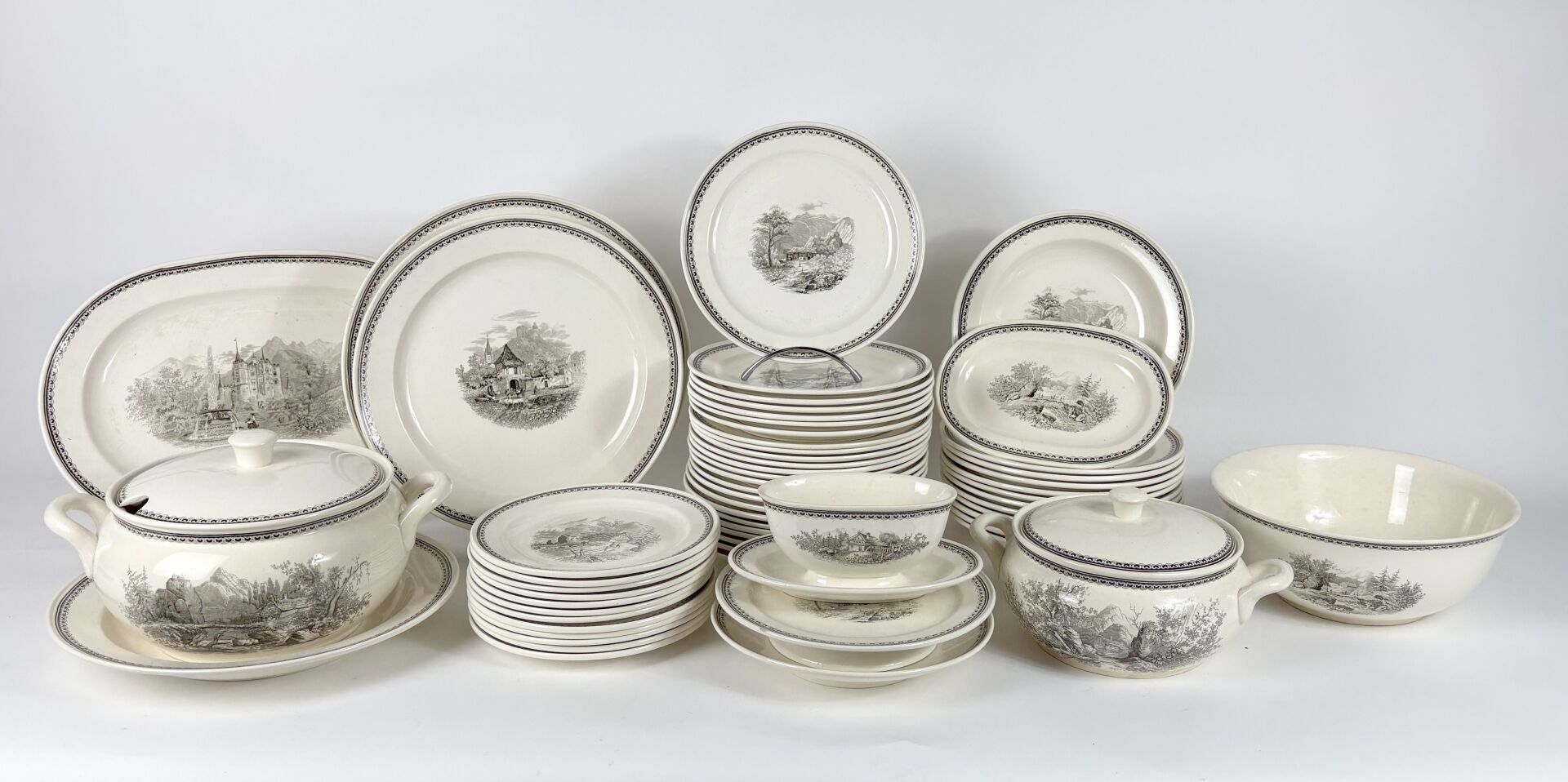 Modèle Alpina – Partie de service de table en faïence crème à décor en grisaille de paysages de montagne (nombreux décors) comprenant :