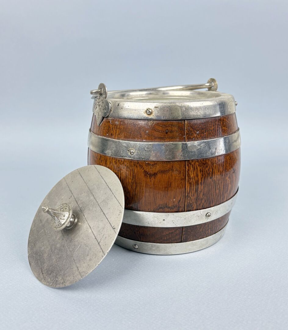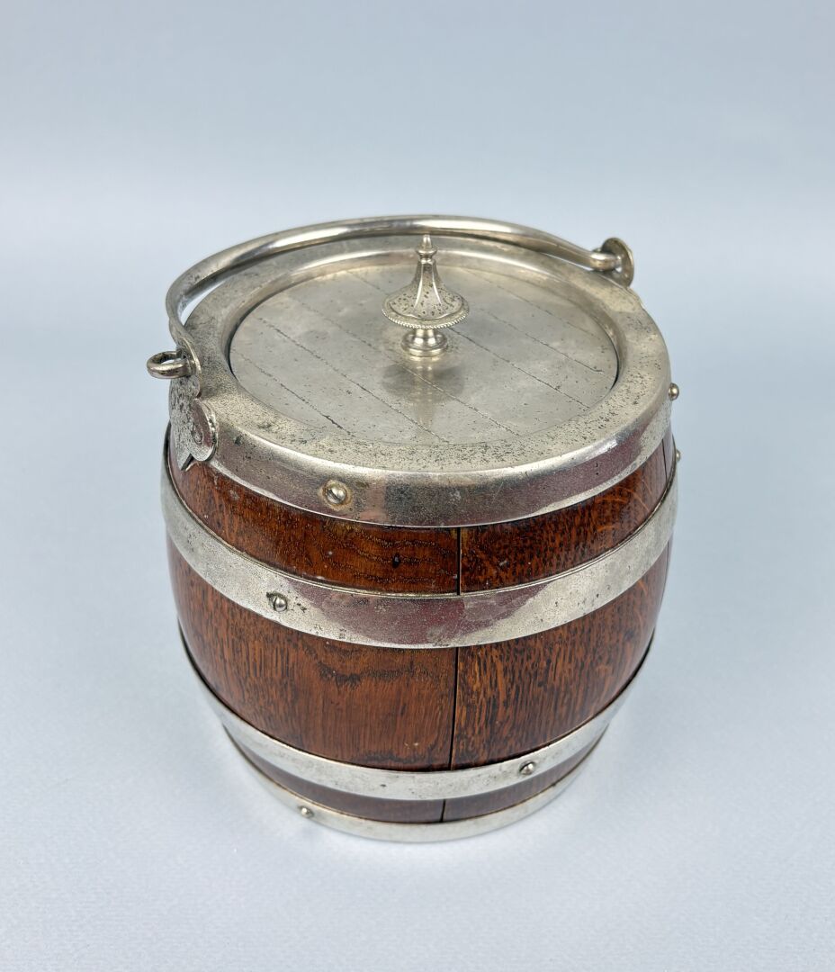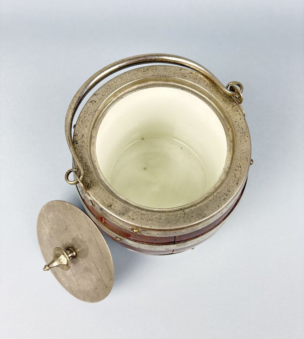 385 ESTIMATION: 30 / 50 € Seau à glaçons anglais en métal argenté et bois, l’intérieur en porcelaine figurant un tonneau avec une anse, flanqué d’un blason. H : 15 cm