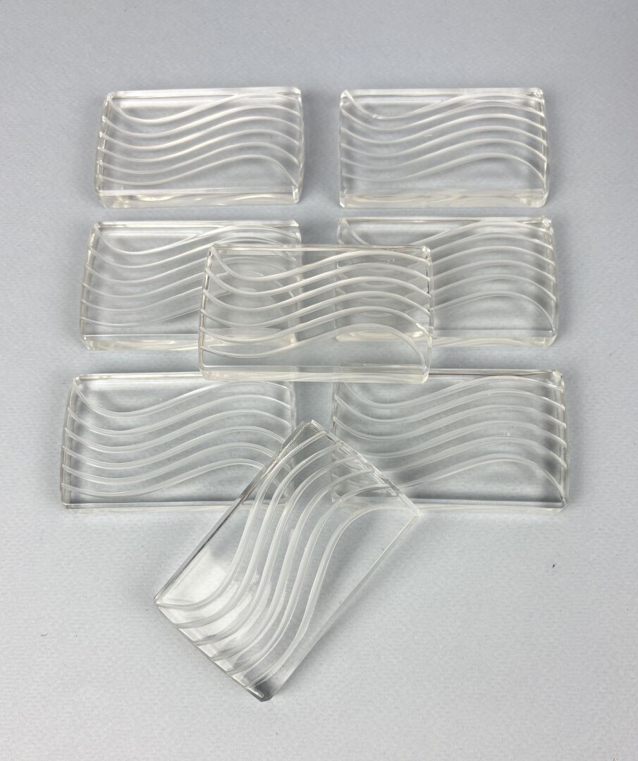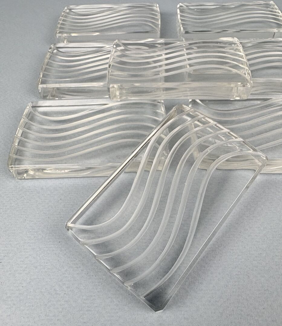 441 ESTIMATION: 80 / 100 € LALIQUE Suite de huit larges porte-couteaux en cristal à décor gravé de vagues Signature gravée Lalique France Travail vers 1930 – 1940 Dans leur boite Dimensions : 5 x 8.5 cm