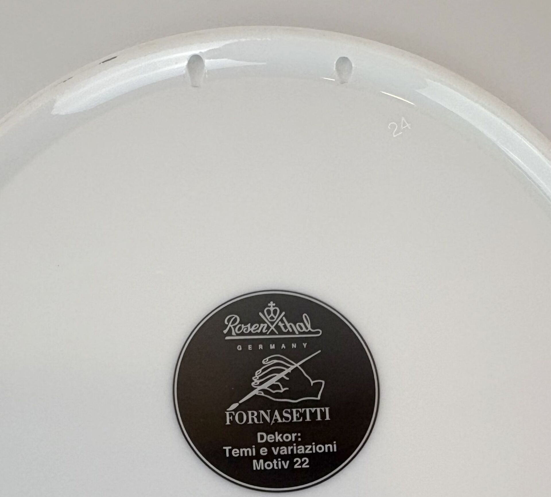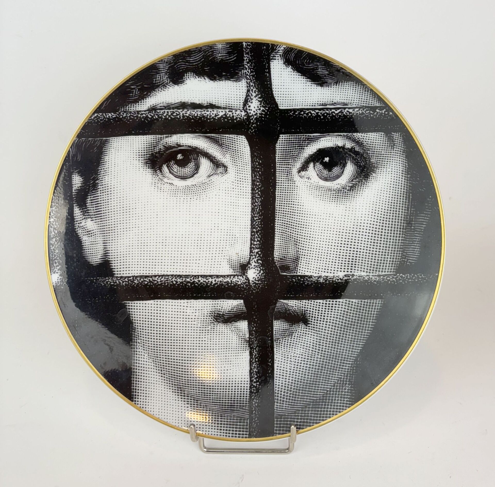 454 ESTIMATION: 130 / 150 € Piero FORNASETTI (1913-1988) pour ROSENTHAL Décor Temi e Variazioni Motiv 22 – Assiette en porcelaine émaillée à décor en grisaille et filet doré D : 23.5 cm