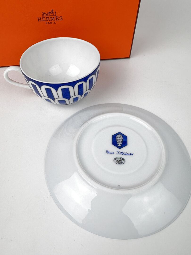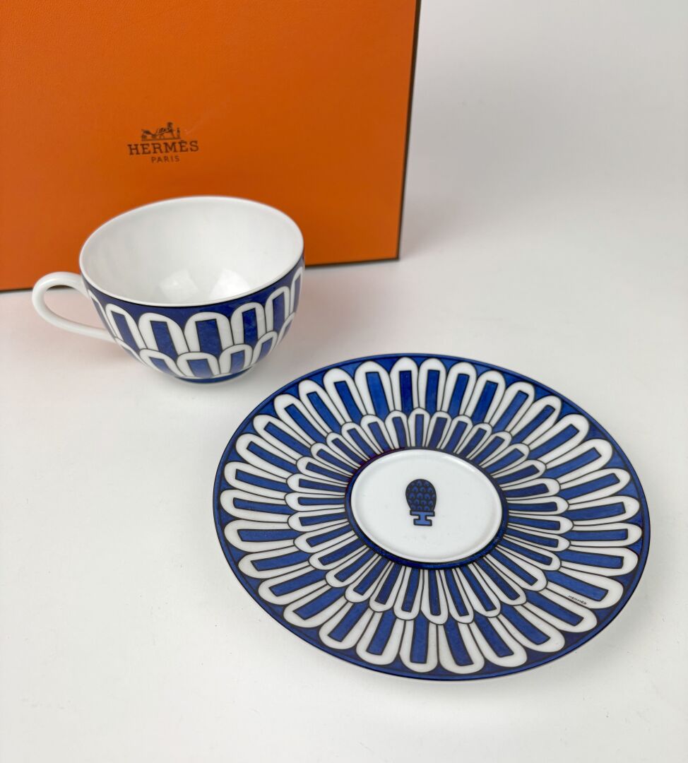 507 ESTIMATION: 50 / 80 € HERMES, Paris Modèle Bleus d’ailleurs – Tasse et sa sous-tasse en porcelaine Dans sa boîte