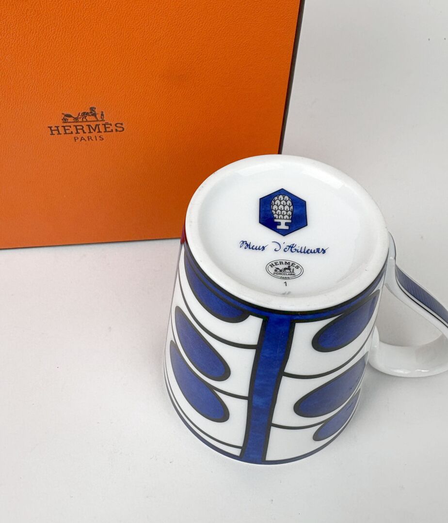 508 ESTIMATION: 50 / 80 € HERMES – Paris Modèle Bleus d’ailleurs – Mug en porcelaine dans les tons bleu Dans sa boîte H : 9.5 cm