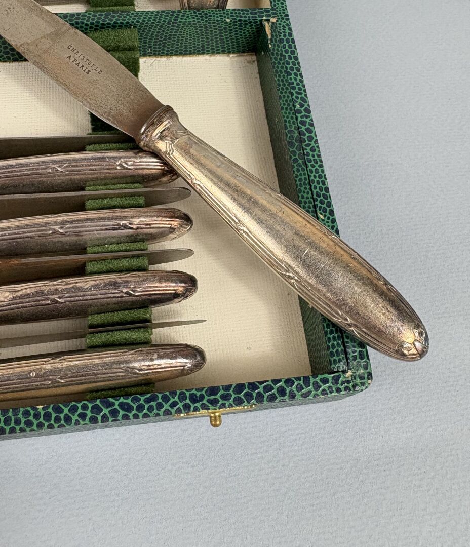 Modèle Rubans Croisés – Suite de douze couteaux de table et neuf demi-couteaux en métal argenté, lames acier