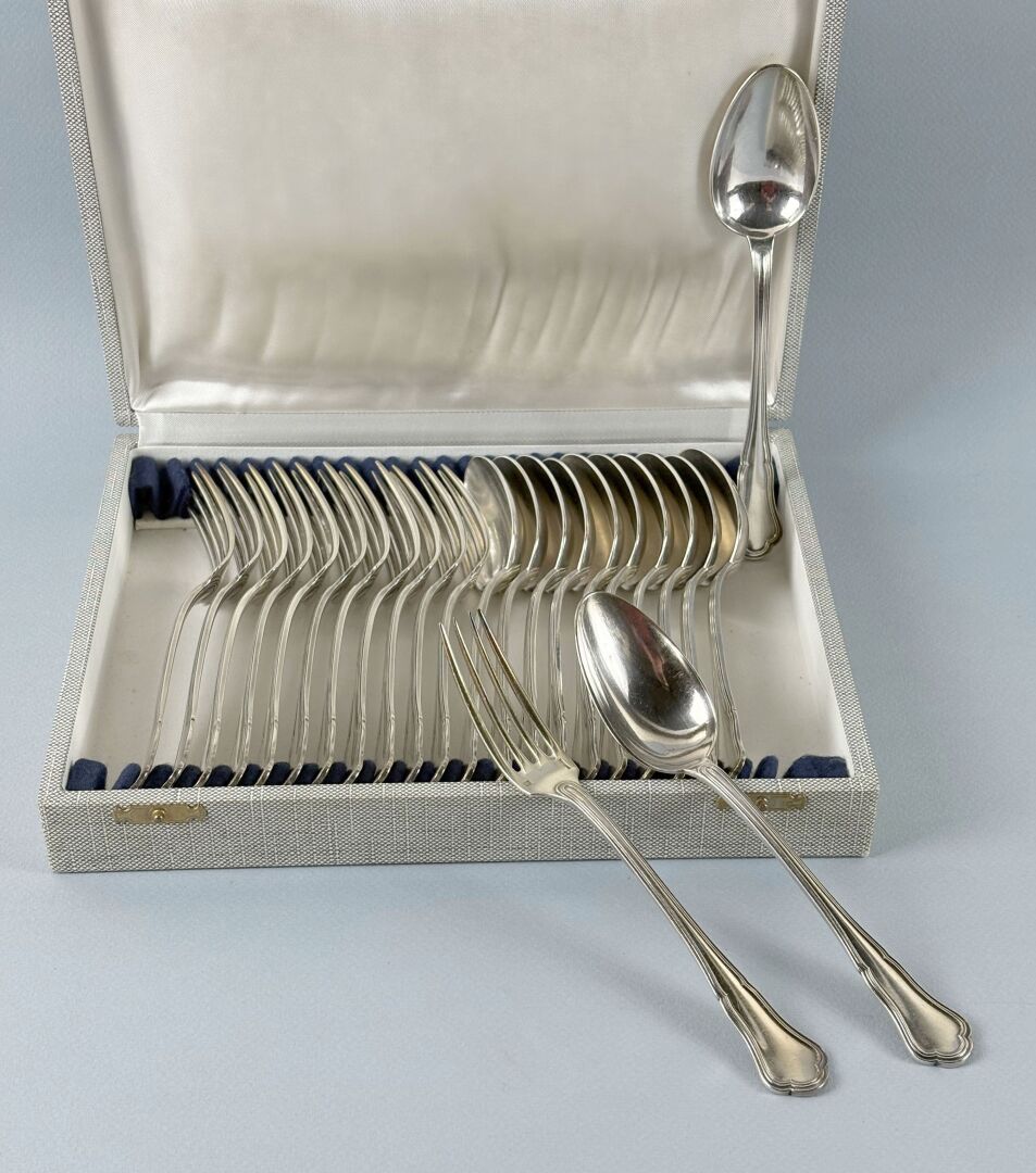 84 ESTIMATION: 80 / 120 € CHRSTOFLE Suite de douze demi-couverts en métal argenté à manche violoné à filets chiffrés « JS » Dans un écrin