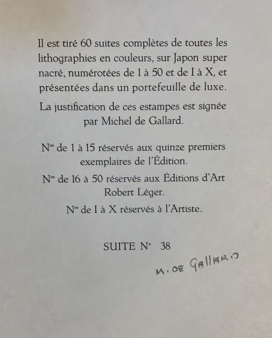 106 ESTIMATION: 100 / 200 € GALLARD, Michel de (1921-2007) Le Piéton de Paris Grand portefeuille in plano constitué de 15 lithographies en couleur, numéroté 38 sur japon super nacré Edition Robert Léger