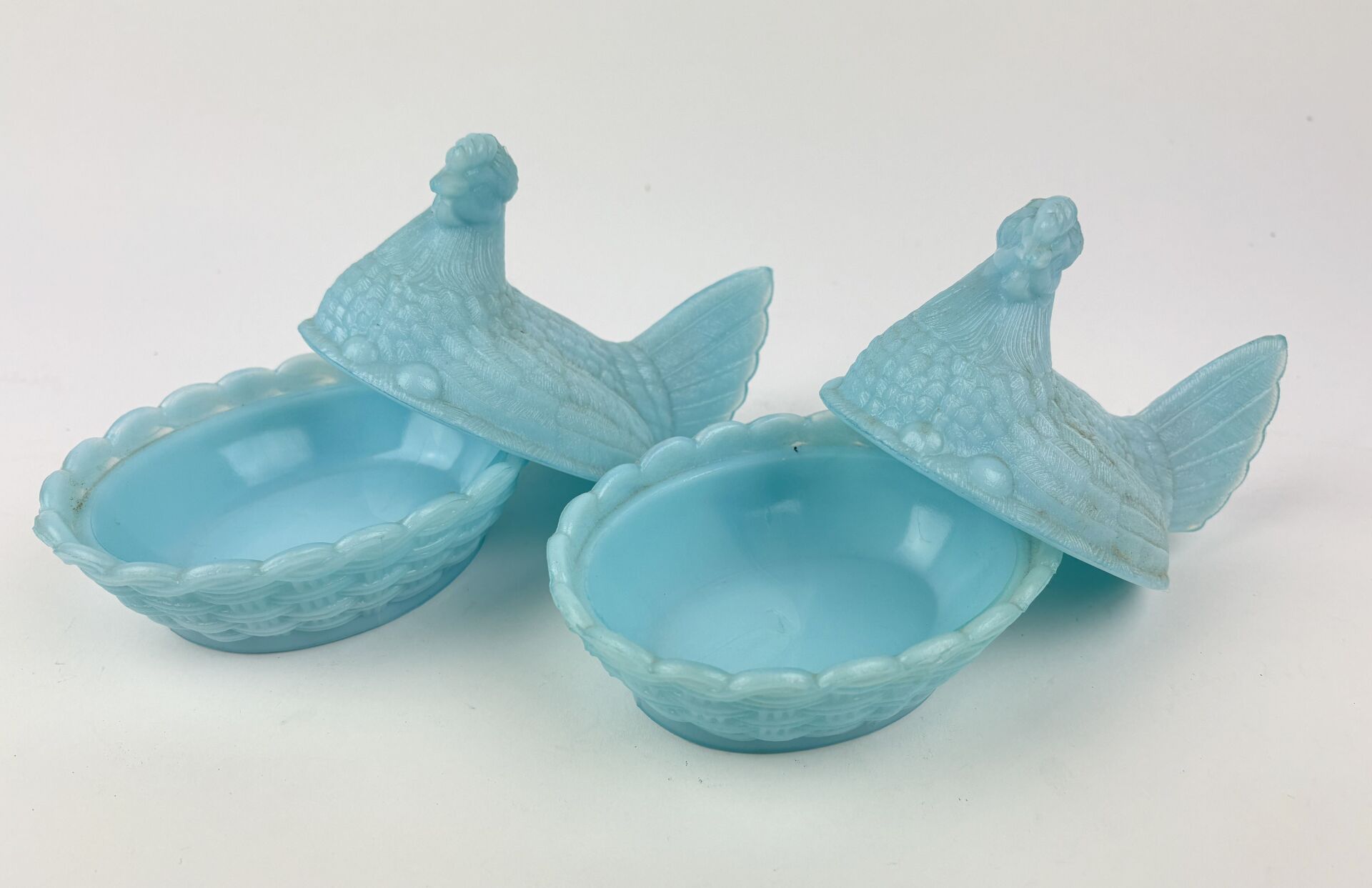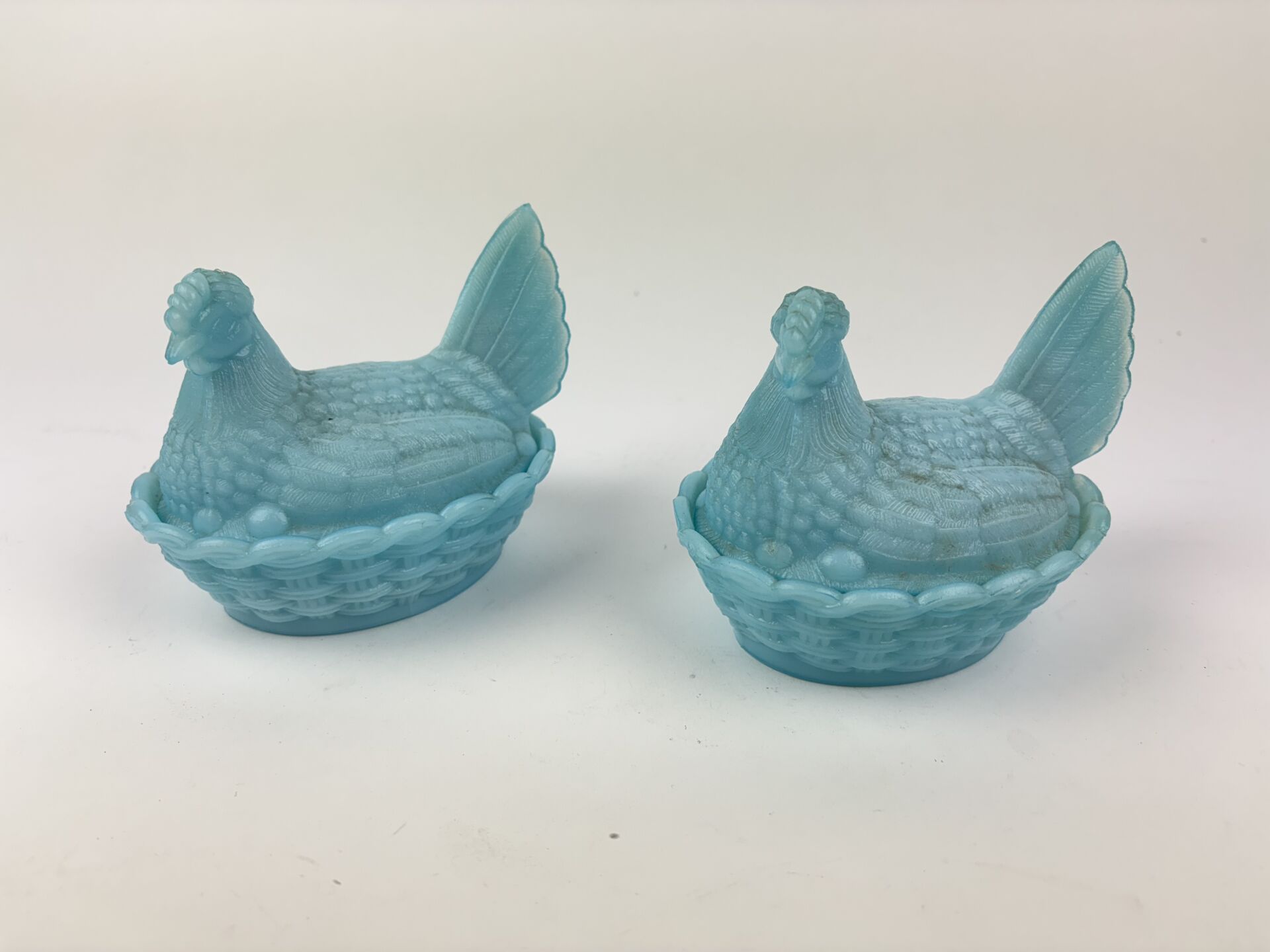 114 ESTIMATION: 20 / 30 € Paire de beurriers en opaline de foire bleu à décor de poule dans un panier H : 10 – L : 14 – P : 10 cm