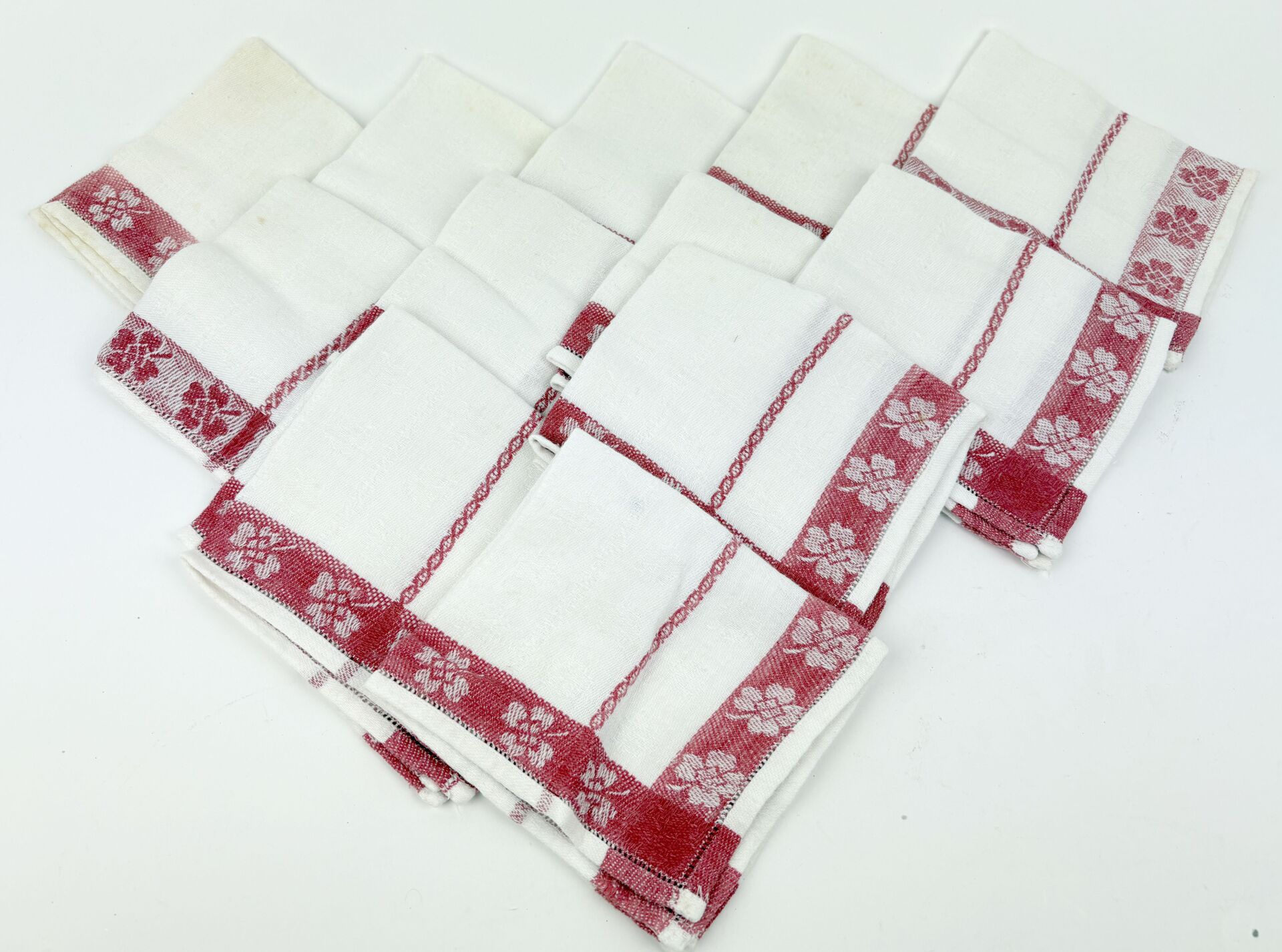 124 ESTIMATION: 10 / 20 € Suite de 12 serviettes à thé en coton damassé rouge et blanc à décor de trèfles Deux serviettes largement tâchées et décolorées 24 x 24 cm