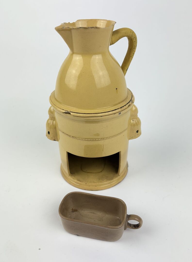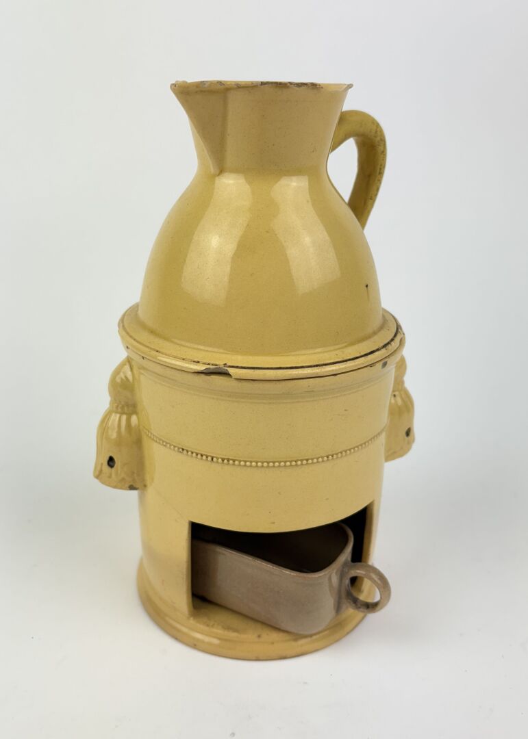 137 ESTIMATION: 20 / 30 € APT Tisanière en faïence vernissée jaune, bruleur probablement rapporté Accidents, anse restaurée Travail fin XVIII°, début XIX° H : 20 cm