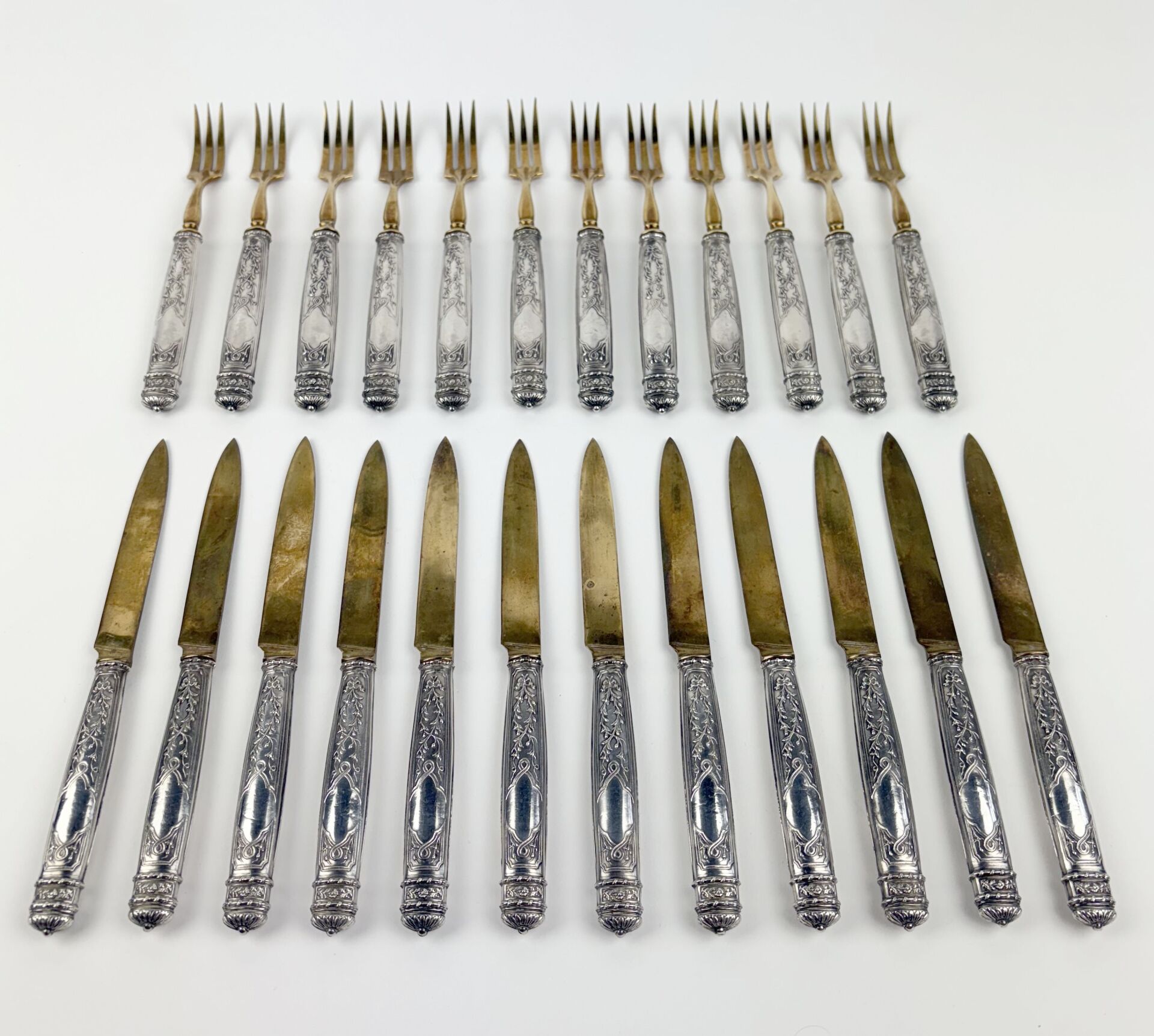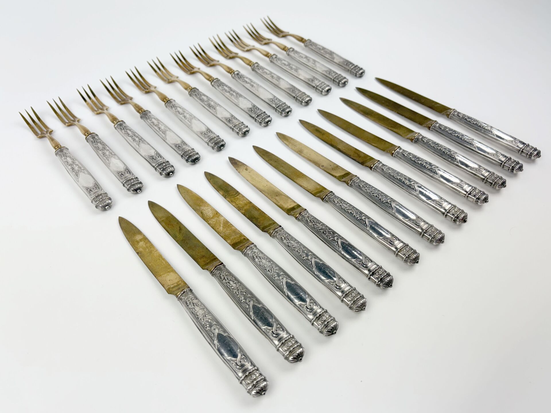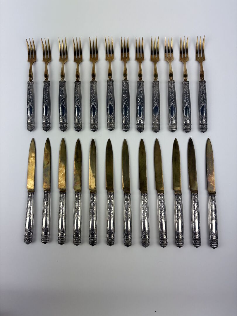 143 ESTIMATION: 60 / 80 € Suite de douze couverts à fruits, lames et fourchons en métal doré, les manches en argent fourré poinçon minerve Travail XIX° Poids brut : 780 g