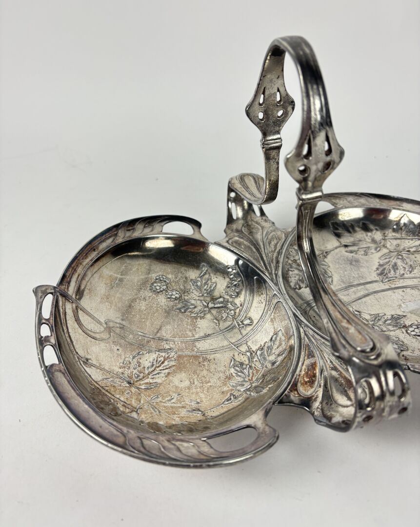 144 ESTIMATION: 20 / 30 € GALIA Serviteur à deux compartiments en métal argenté partiellement ajouré à décor de mûres Travail vers 1900 Restauration ancienne et léger accident L : 30 – H : 17 cm