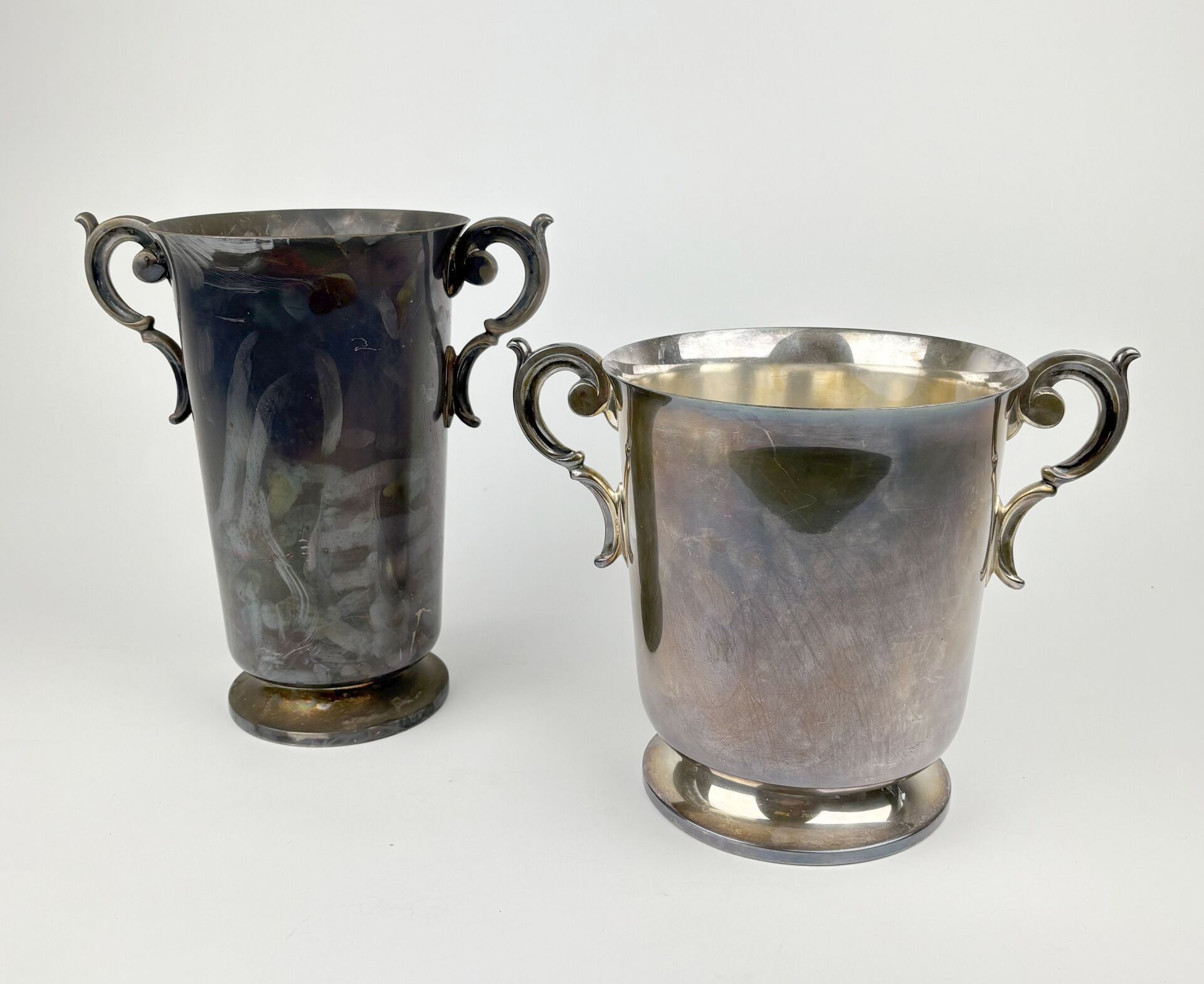 145 ESTIMATION: 30 / 50 € RENEKA Seau à bouteille et seau à champagne en métal argenté à deux anses figurant des rinceaux Rayures d’usage, oxydations et enfoncements H : 23.5 et 28 cm