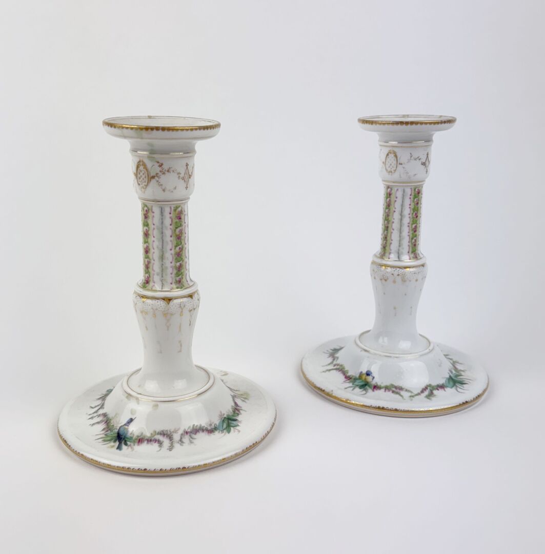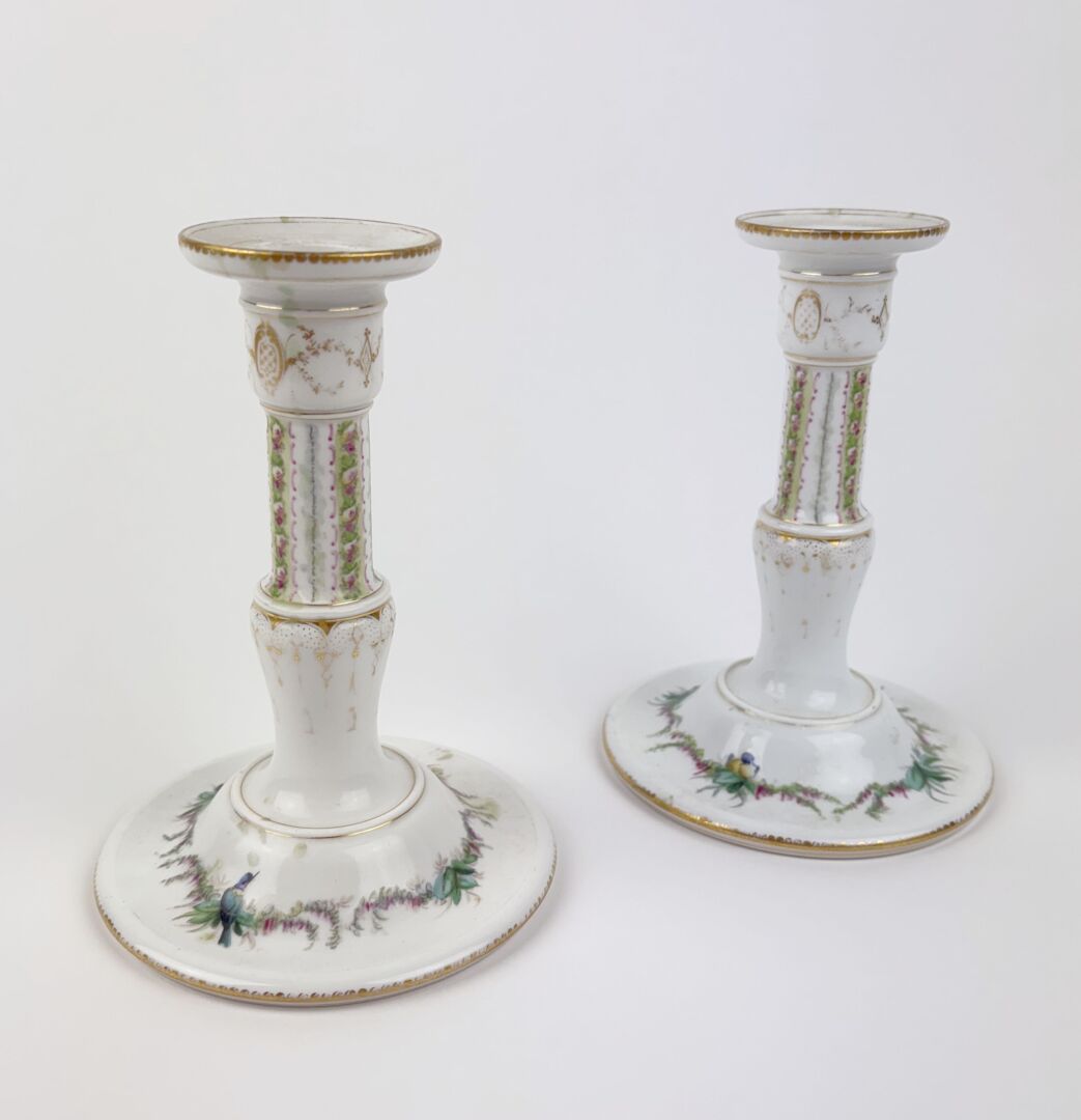 156 ESTIMATION: 60 / 80 € SEVRES, 1855 Paire de flambeaux en porcelaine blanche à décor peint de guirlandes fleuries, oiseaux et filets dorés Altérations au décor, marque biffée H : 17 cm
