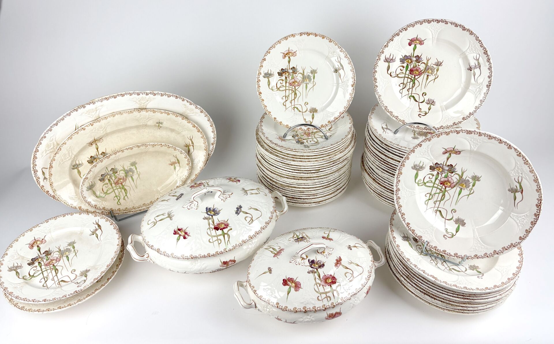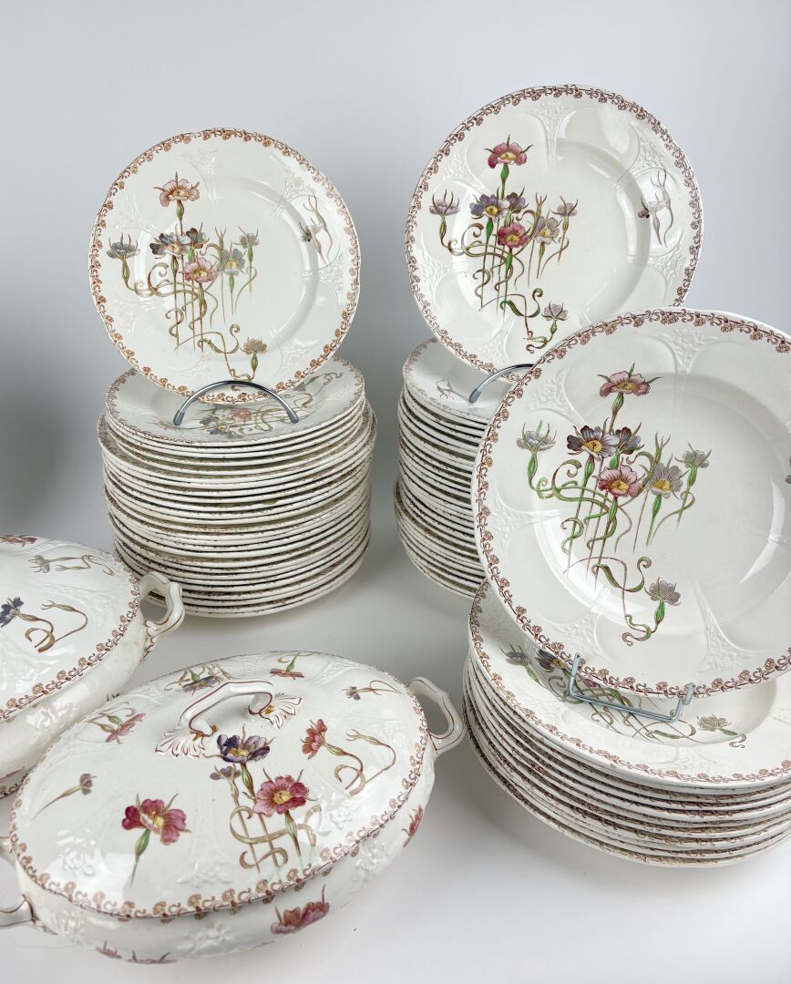 Modèle Nielles – Partie de service de table en faïence dite « Terre de fer » à décor Art Nouveau comprenant :