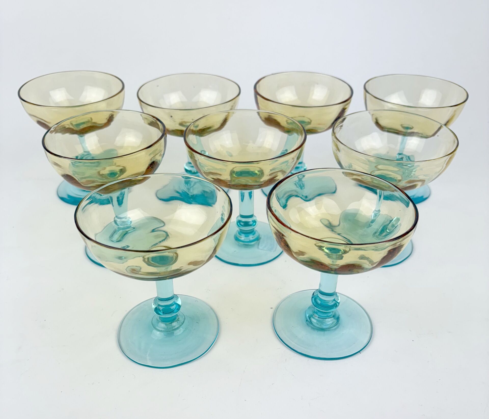 Modèle Georges Sand – Suite de neuf coupes à champagne en verre soufflé ambré et bleuté