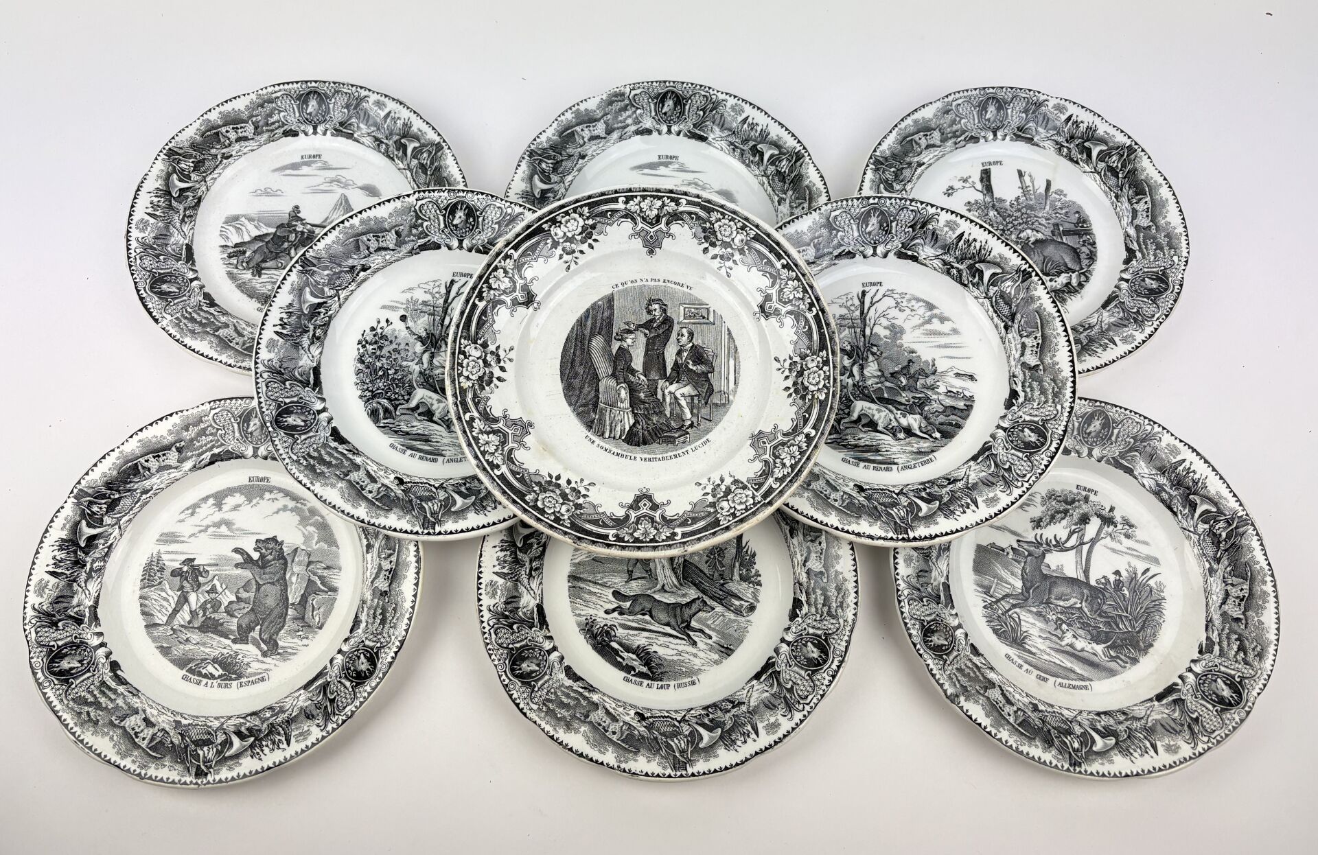 Suite de 8 assiettes en faïence, le marli à décor cynégétique sur le thème de la chasse en Europe