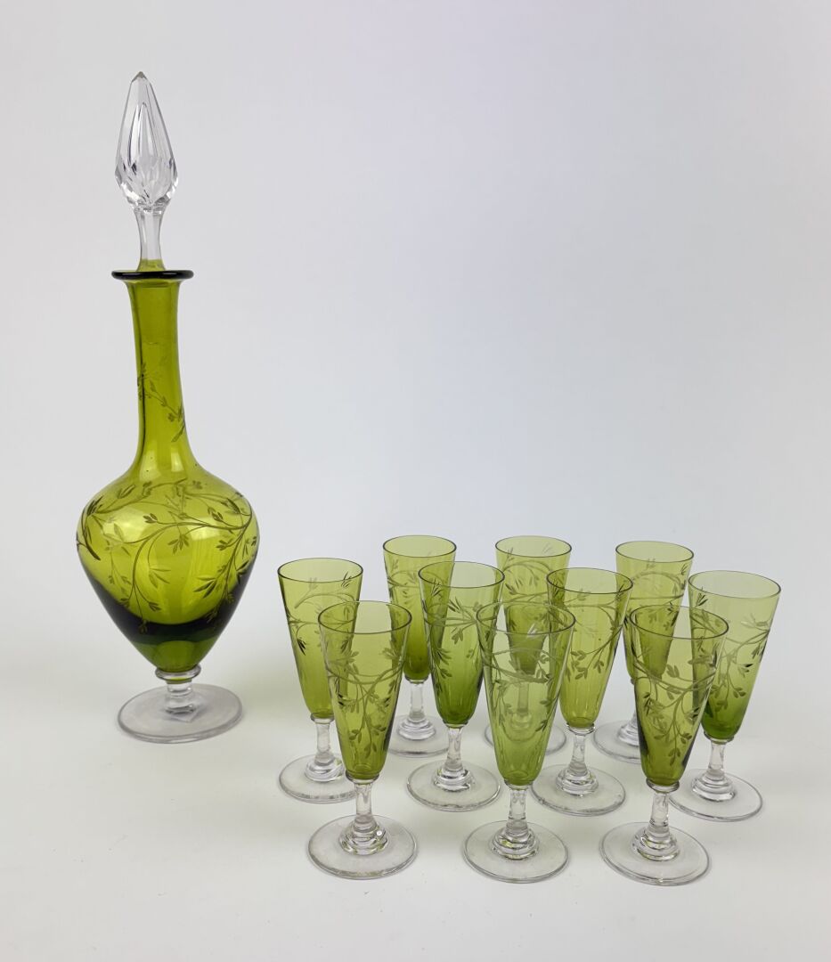 Service à liqueur en cristal taillé vert et transparent à décor de branchages comprenant :