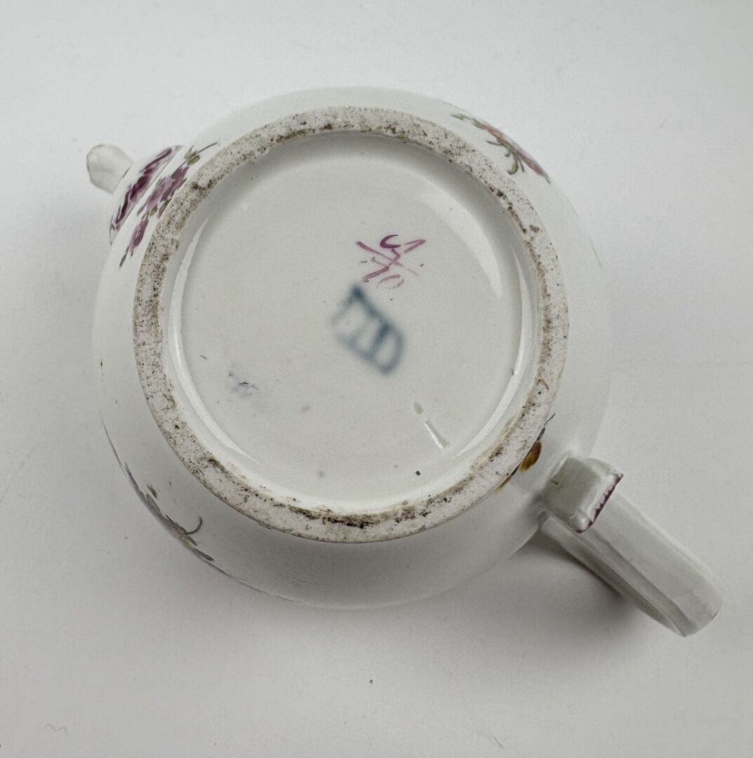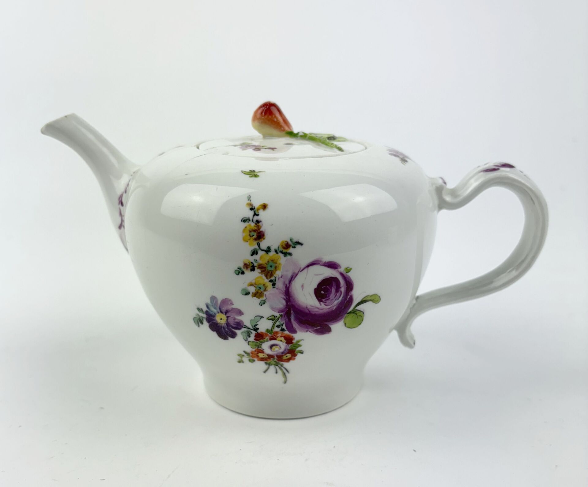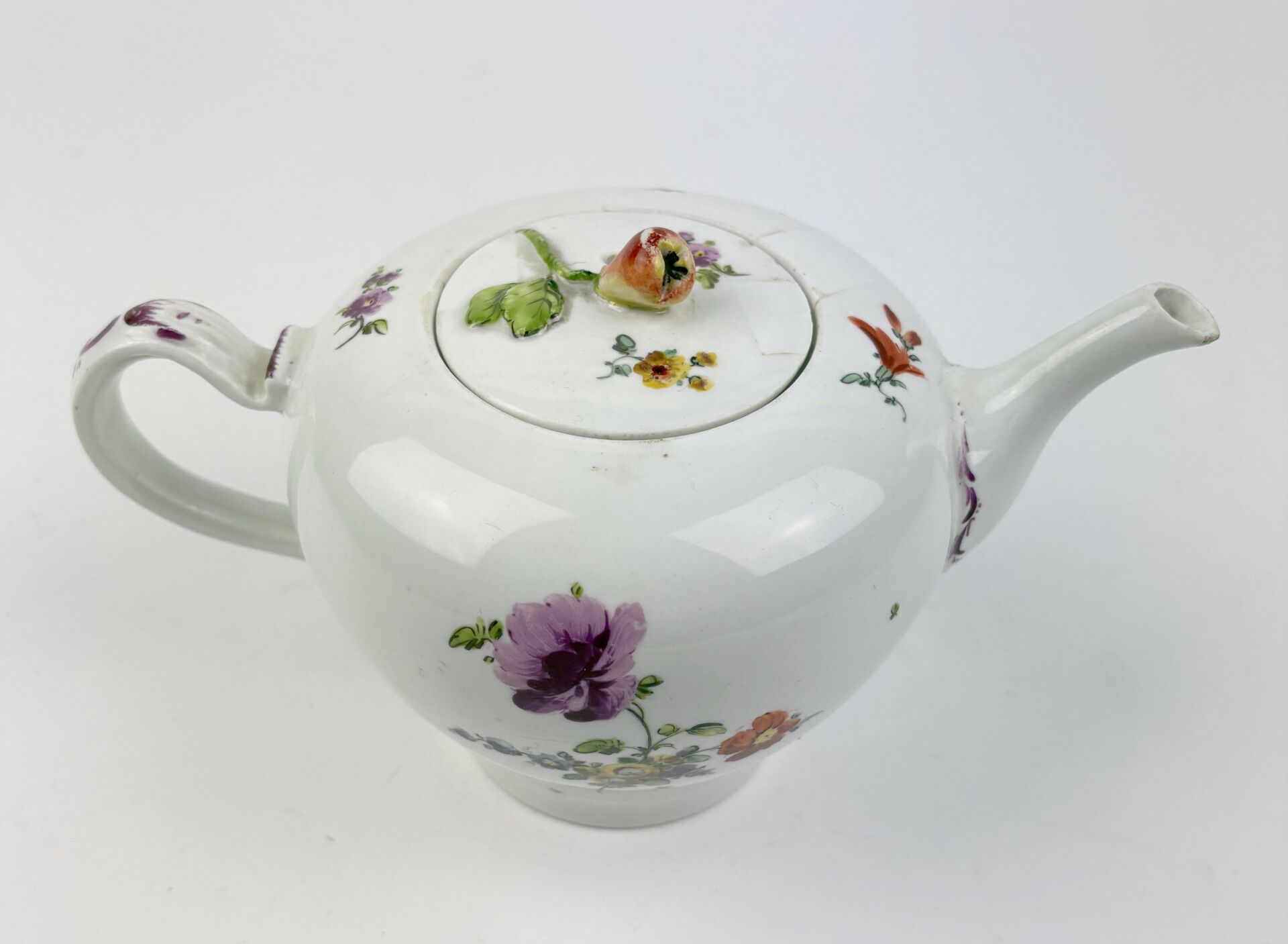 17 ESTIMATION: 30 / 50 € ALLEMAGNE (?) Petite théière en faïence peinte à décor de fleurs et rinceaux, le frêtel figurant une poire, Léger choc au bec Travail XIX° H : 11 cm