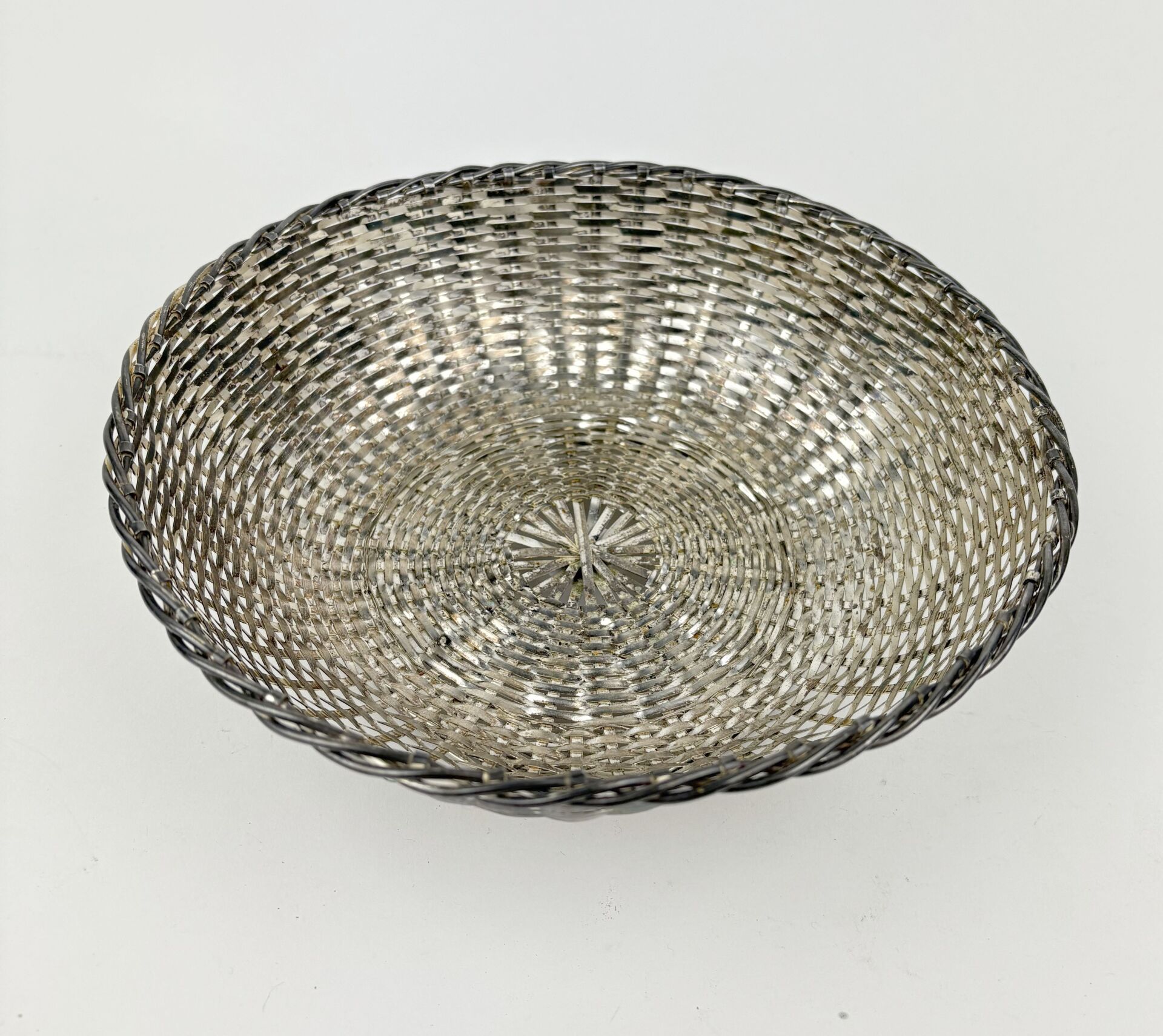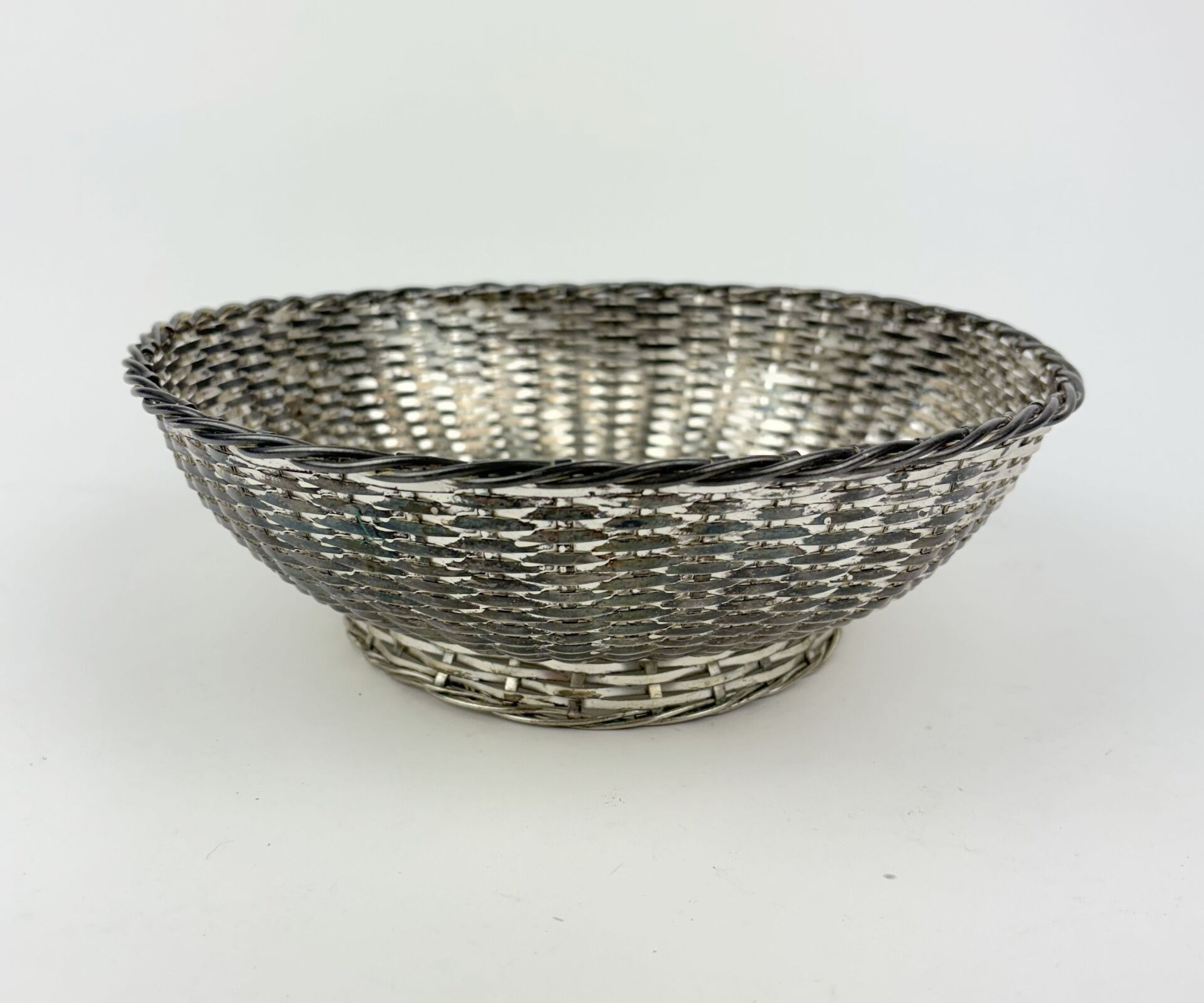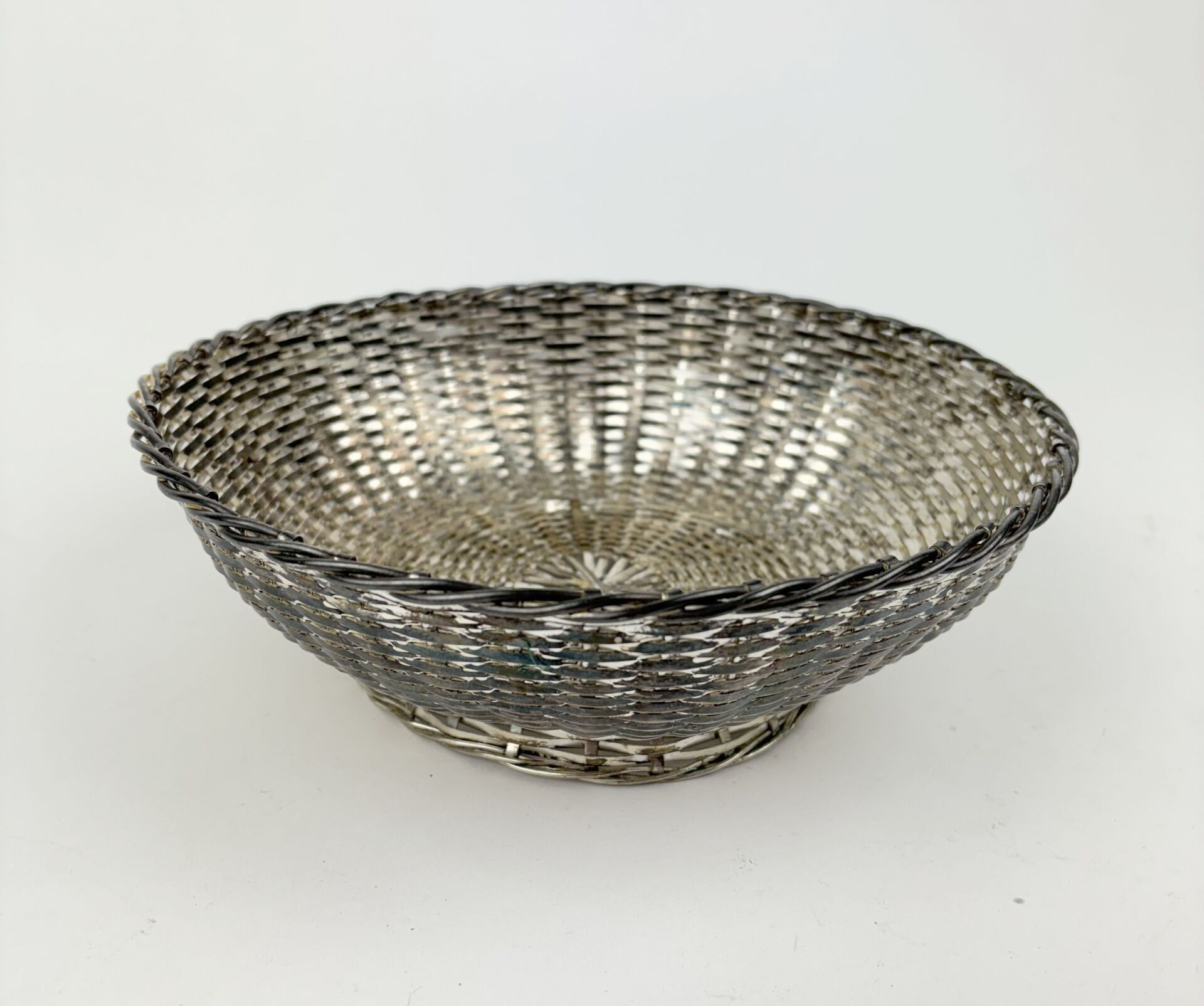 194 ESTIMATION: 30 / 50 € ORFEVRERIE CHRISTOFLE Corbeille sur talon en métal argenté à l’imitation de la vannerie Travail vers 1900 Usures D : 22.5 cm