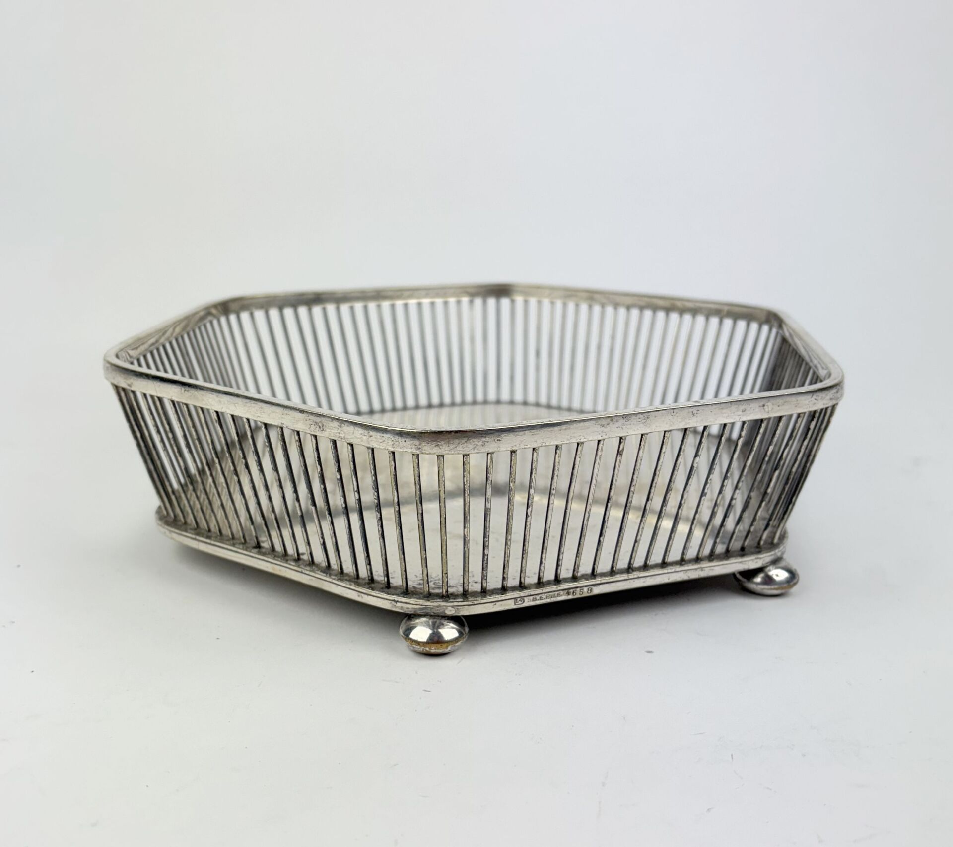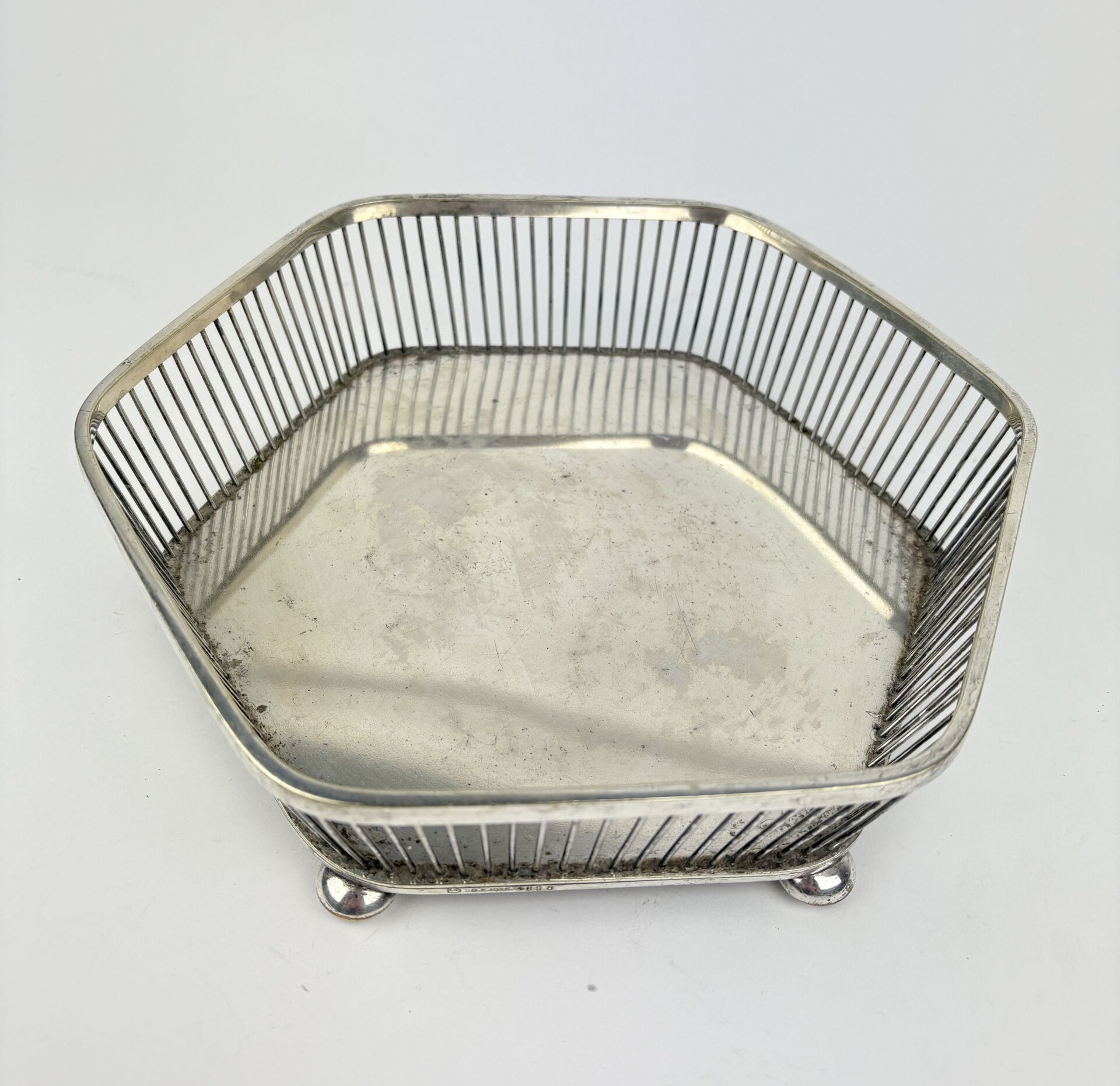 195 ESTIMATION: 40 / 60 € Corbeille à pain en métal argenté de forme hexagonale à bord ajouré reposant sur quatre pieds aplatis Travail vers 1900 D : 24 cm