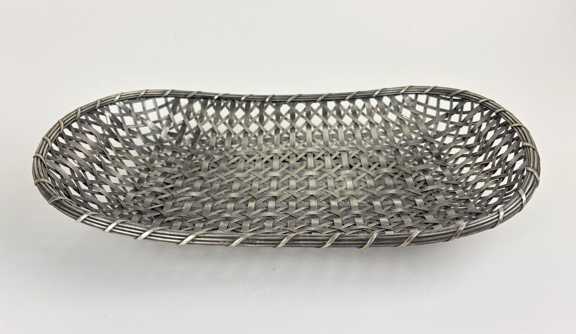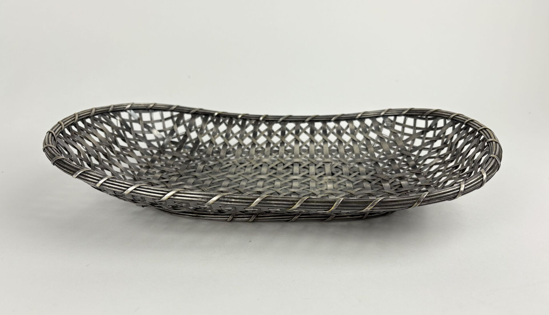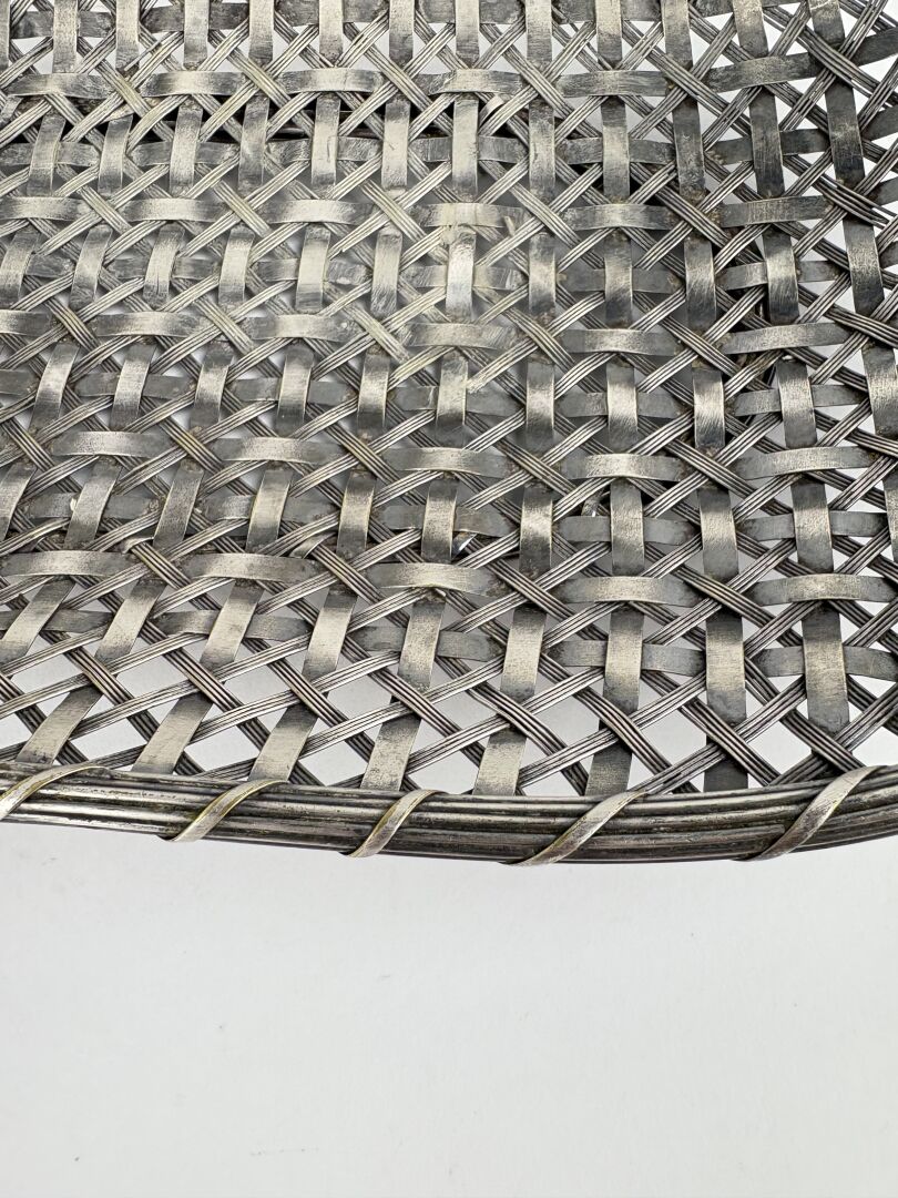 197 ESTIMATION: 60 / 80 € CHRISTOFLE Corbeille à pain sur talon de forme oblongue en métal argenté à l’imitation de la vannerie Oxydations et petits manques Travail XIX° Dimensions : 33 x 20 cm