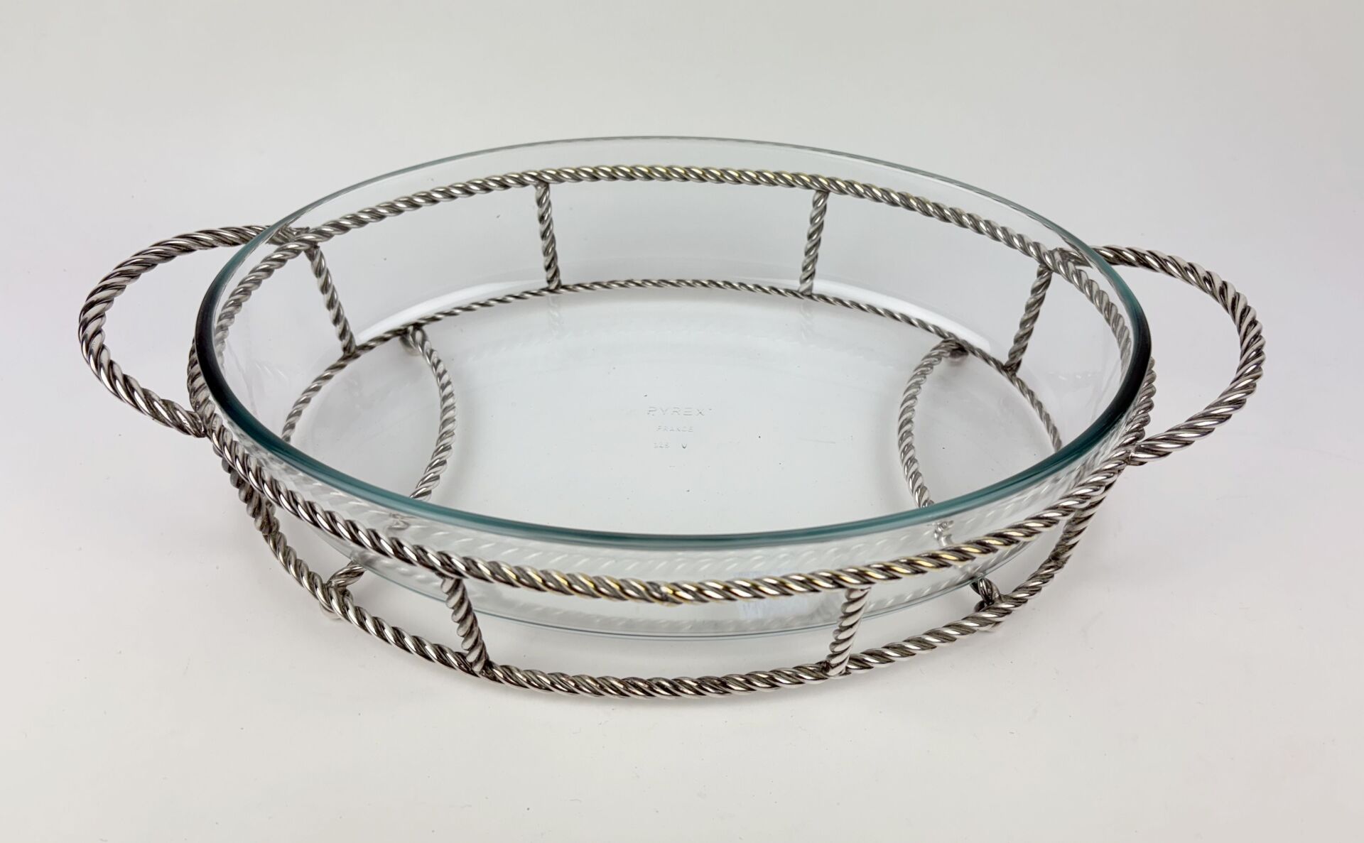 198 ESTIMATION: 60 / 80 € Porte plat en métal argenté à l’imitation de la passementerie à deux anses et son plat en pyrex Dimensions : 37 x 23 cm