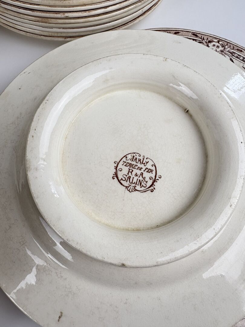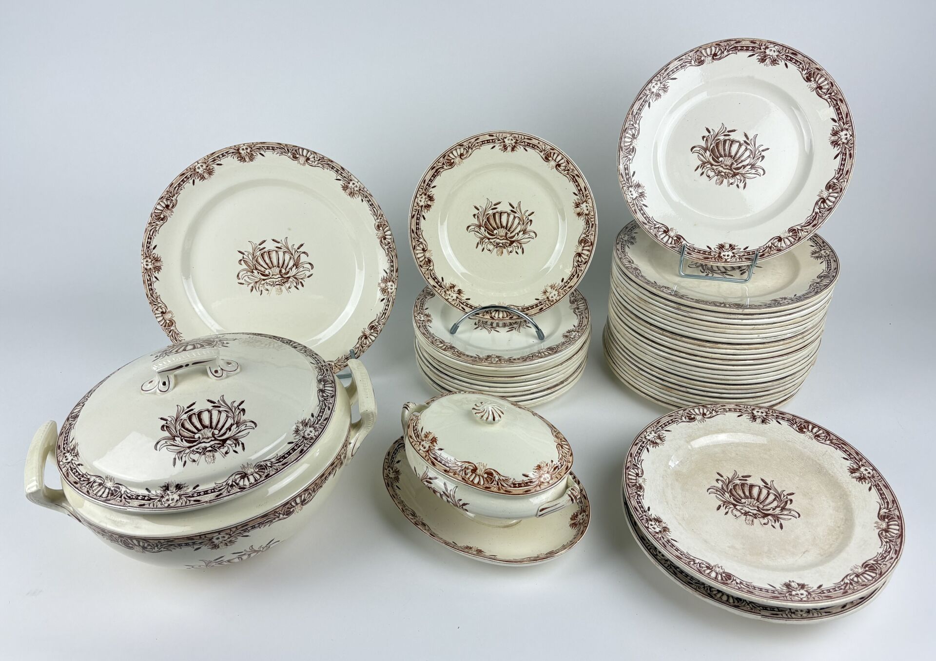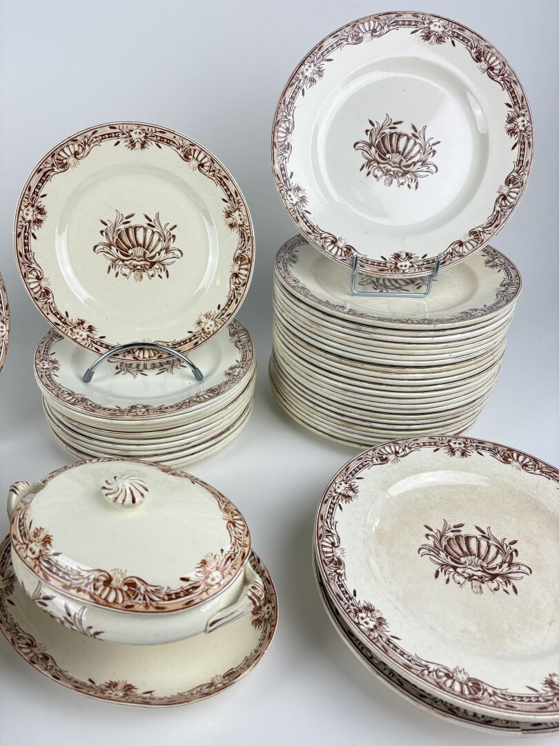 Modèle Marly – Partie de service de table en faïence dite terre de fer à décor de fontaines, coquilles, rinceaux et joncs sépia sur fond crème comprenant :