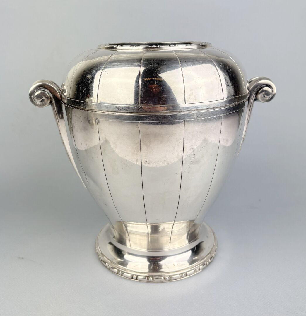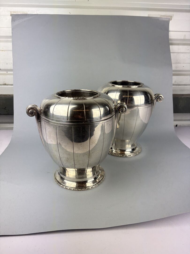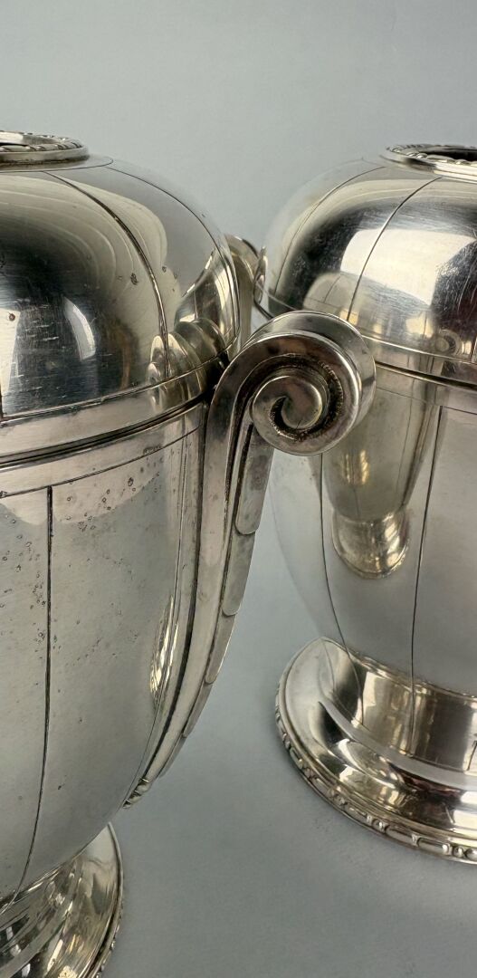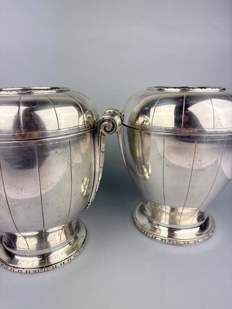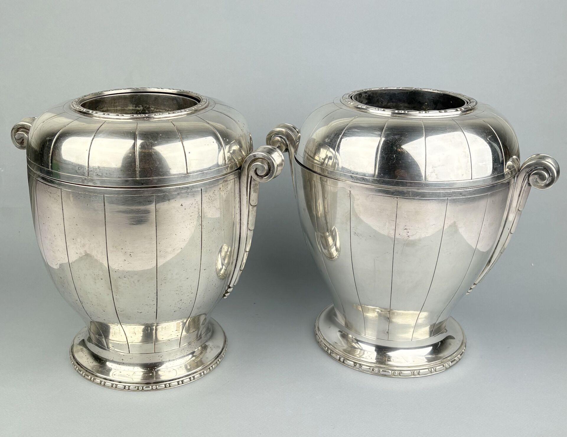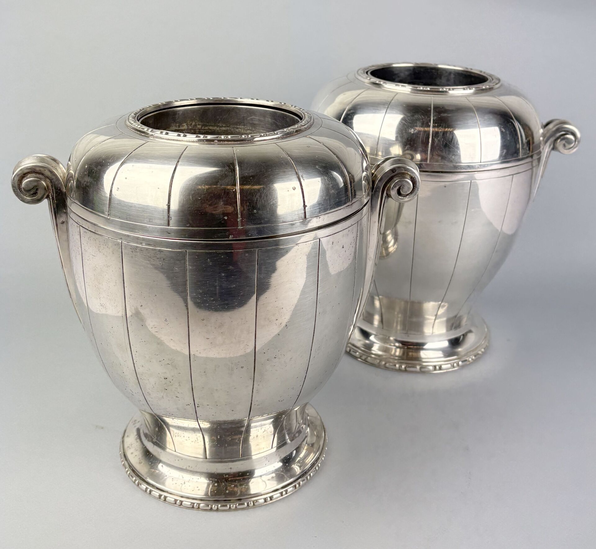 Paire de rafraichissoirs à bouteille en métal argenté de forme ovoide à deux anses décorés de cannelures, double frise, réservoir en métal argenté et parties hautes amovibles