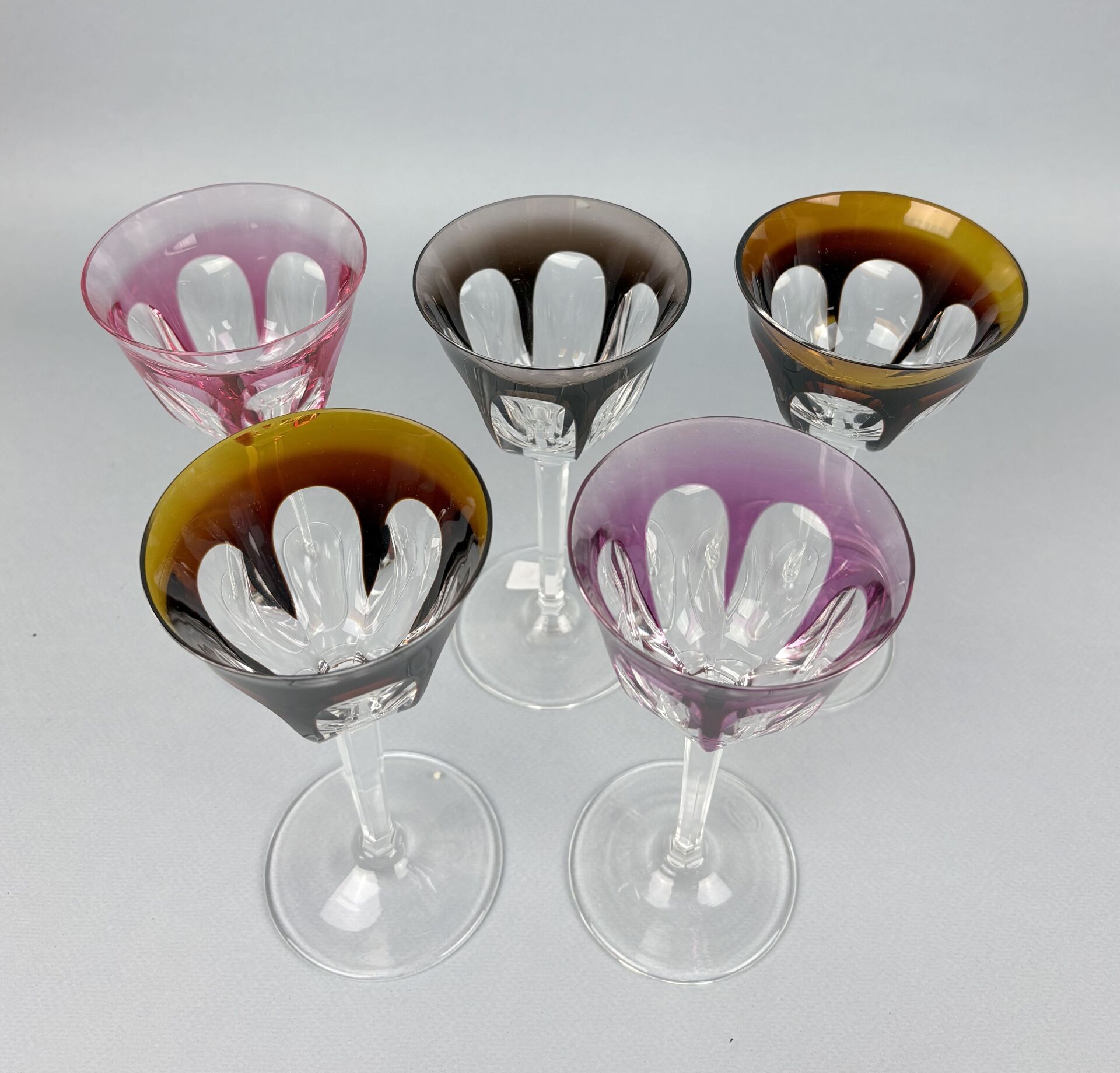 245 ESTIMATION: 60 / 80 € MOSER Suite de cinq verres à vin du Rhin en cristal overley Léger éclat au buvant de l’une H : 18 cm