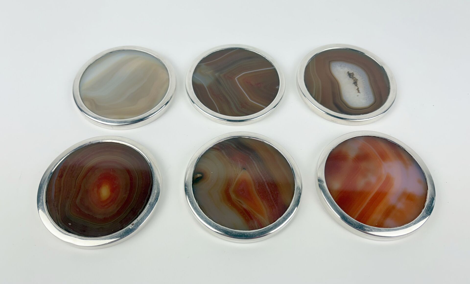 263 ESTIMATION: 60 / 80 € Suite de six dessous de verres composés d’une tranche d’agate cerclée de métal argenté Travail vers 1970 Oxydation sur un D : 8.4 cm