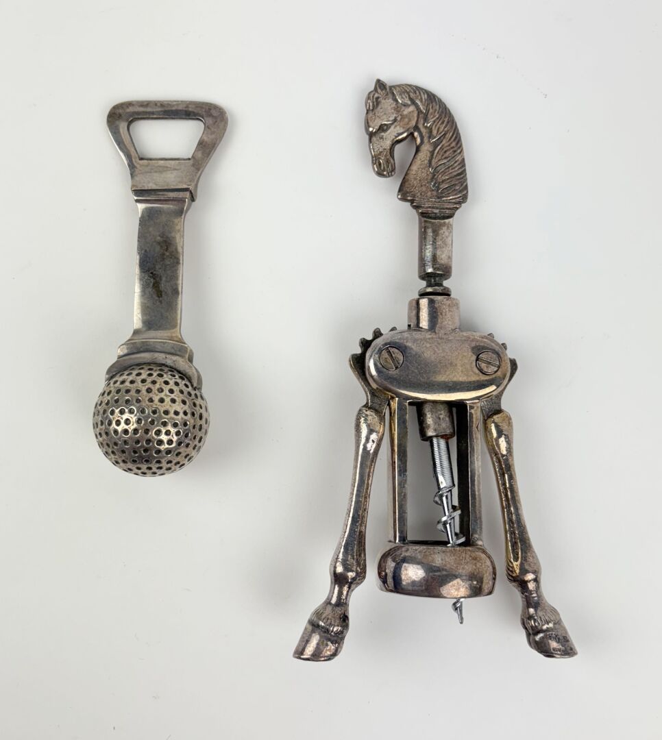 On y joint un tire bouchon en métal argenté à décor de têtes et pattes de cheval