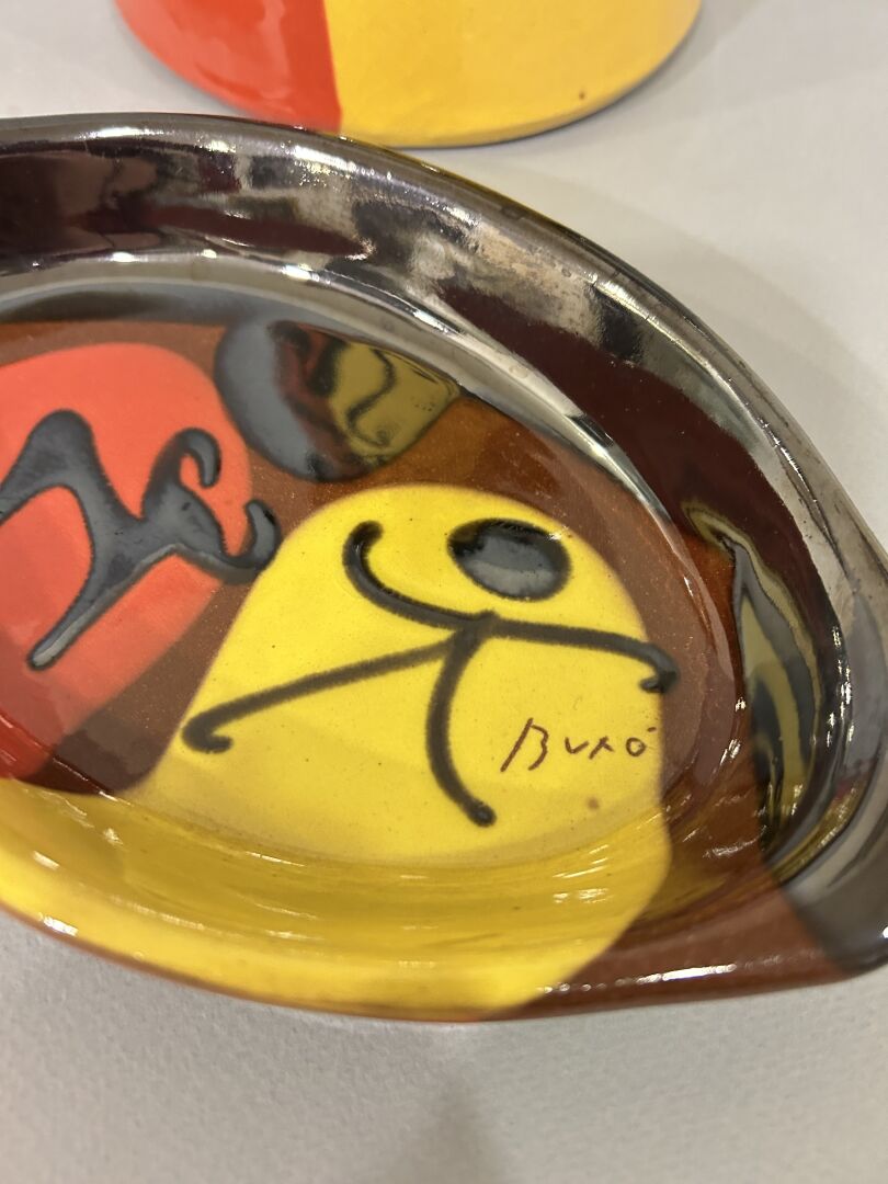 294,1 ESTIMATION: 80 / 120 € Thomas BUXO (XX°) – Ensemble en céramique émaillé rouge et or à décor de scène de tauromachie, comprenant un broc et deux vides poches