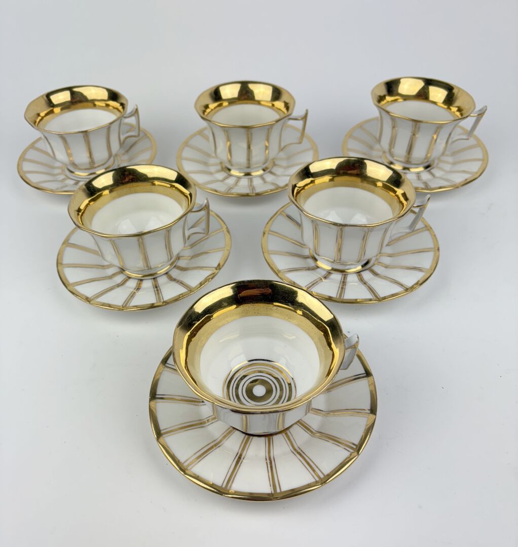 Suite de six tasses et sous tasses à thé en porcelaine à pans coupés à décor de double filet or, l’intérieur du buvant à décor d’un large filet or et de cercles concentriques dorés