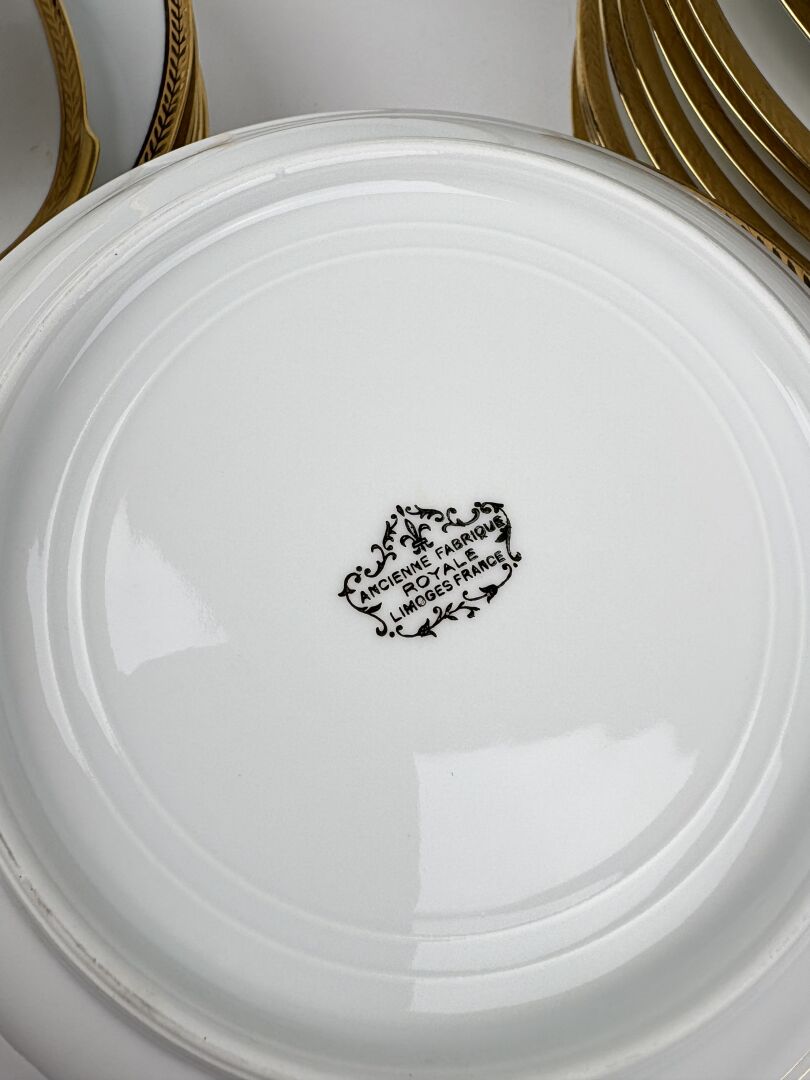 63 ESTIMATION: 80 / 120 € ANCIENNE FABRIQUE ROYALE DE LIMOGES Service de table en porcelaine blanche à décor de large frise dorée de feuilles de laurier comprenant : – 20 Grandes assiettes – 10 Assiettes creuses – 1 Saucière – 1 Plat rond