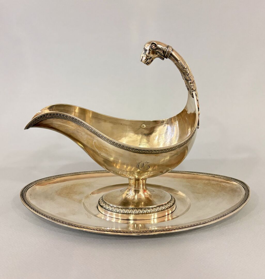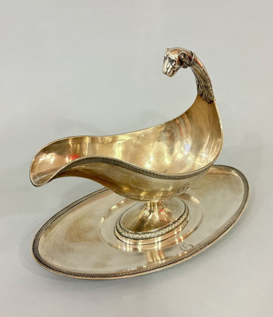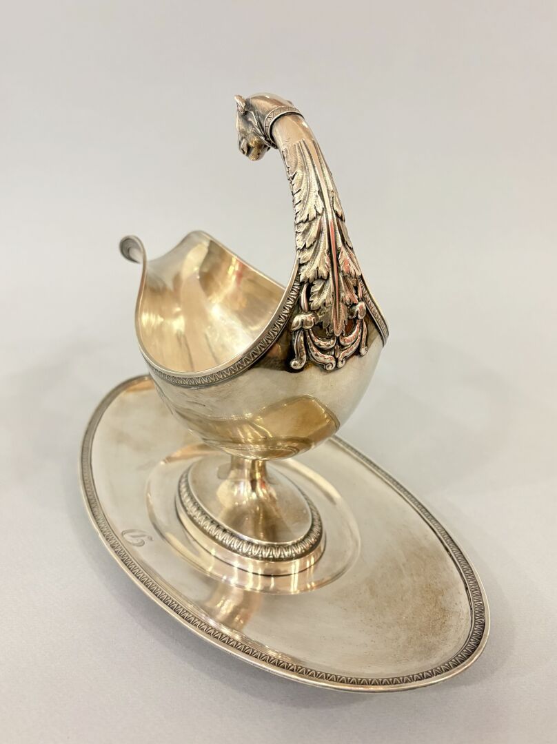 Importante saucière en argent au premier coq la prise formant une gueule de lion, la saucière à bec et son dormant son orné d’une frise de palmette