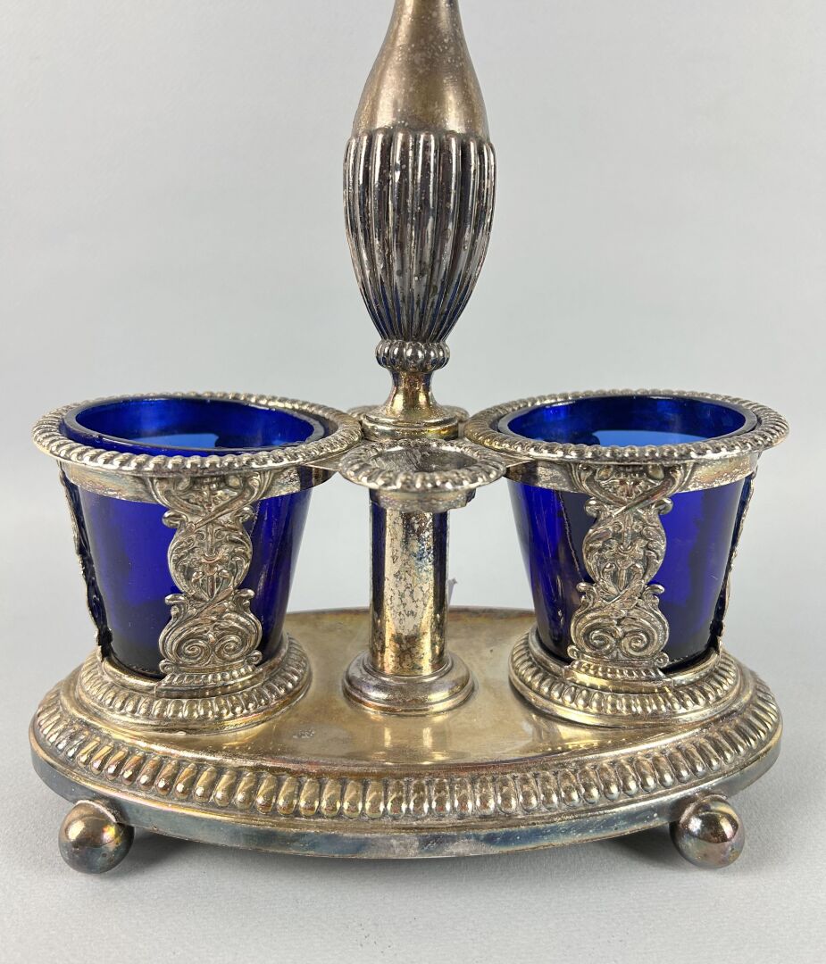 69 ESTIMATION: 80 / 120 € Saleron double en métal argenté à riche décor de feuillages stylisés et de frises de godrons reposant sur quatre pieds boule, verrines en verre teinté bleu H : 31 cm