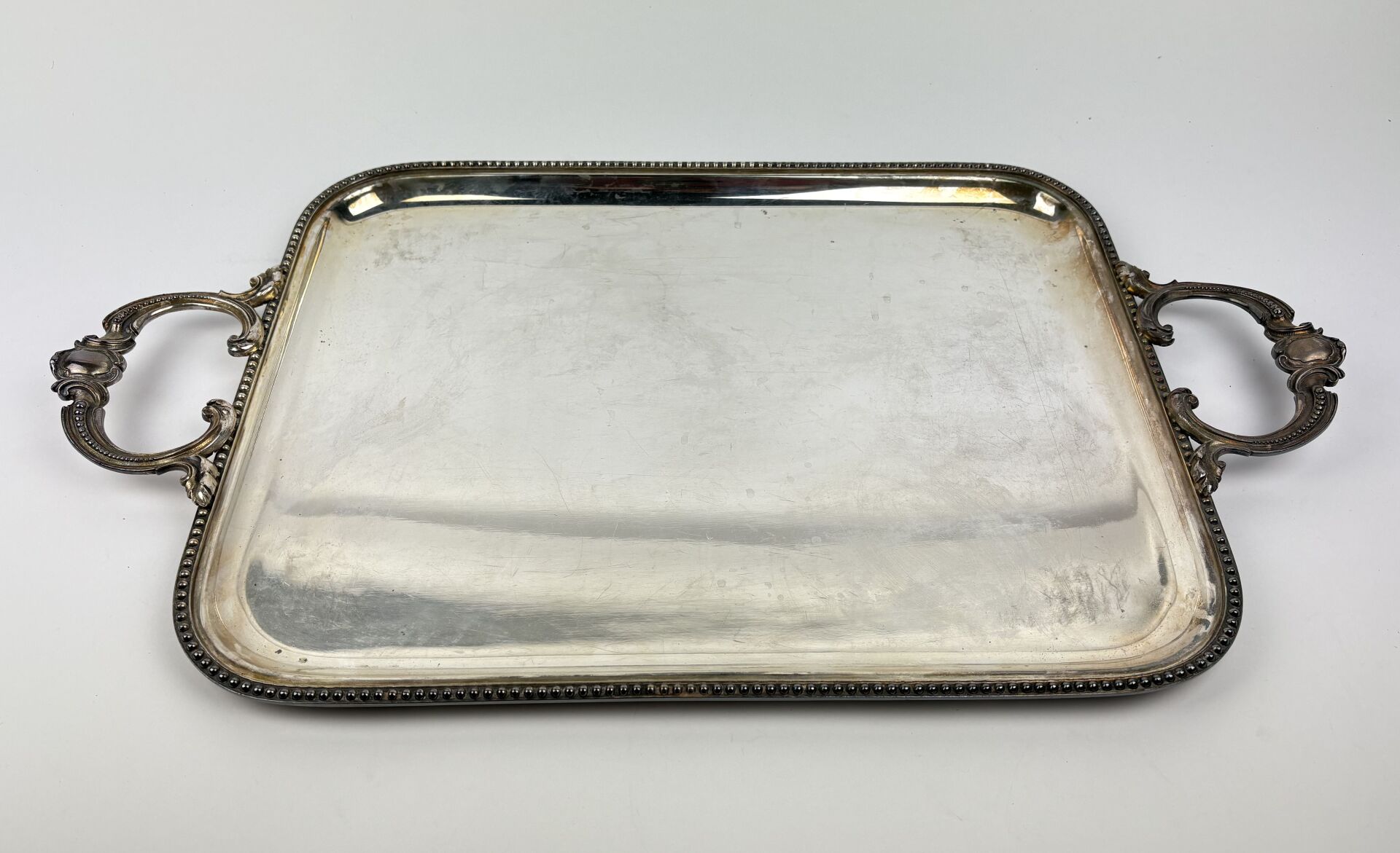 Plateau en métal argenté à deux anses à motifs de rinceaux et cartouches, les bords ornés d’un rang de perles