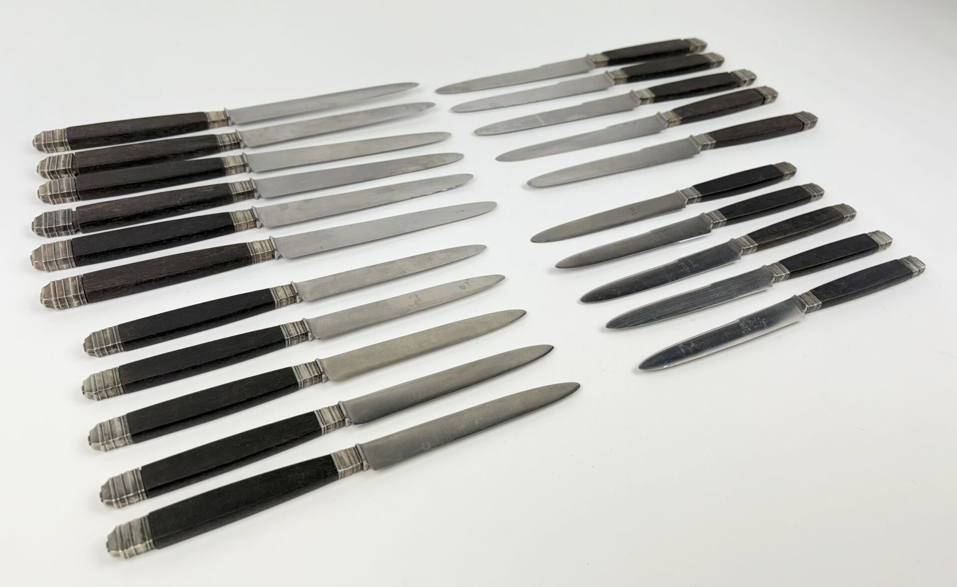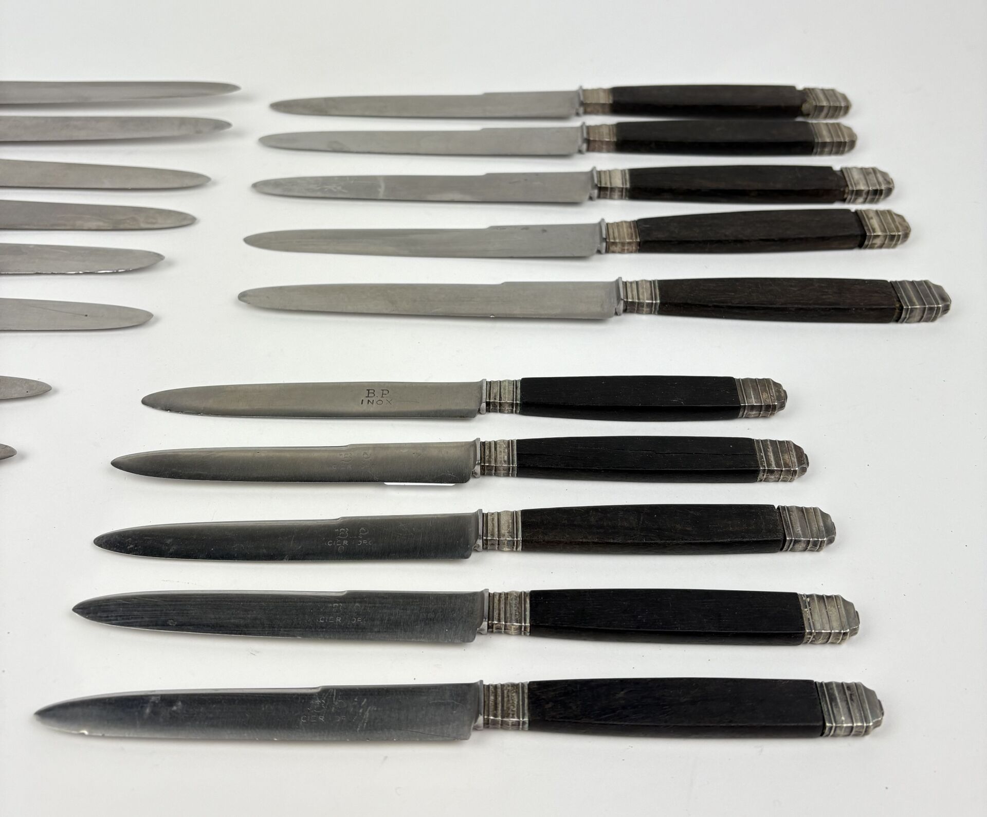 80 ESTIMATION: 50 / 80 € Suite de 11 couteaux de table et 10 couteaux à dessert, manche en ébène et métal argenté, lames acier Travail XIX° Certains fendus, traces de rouille