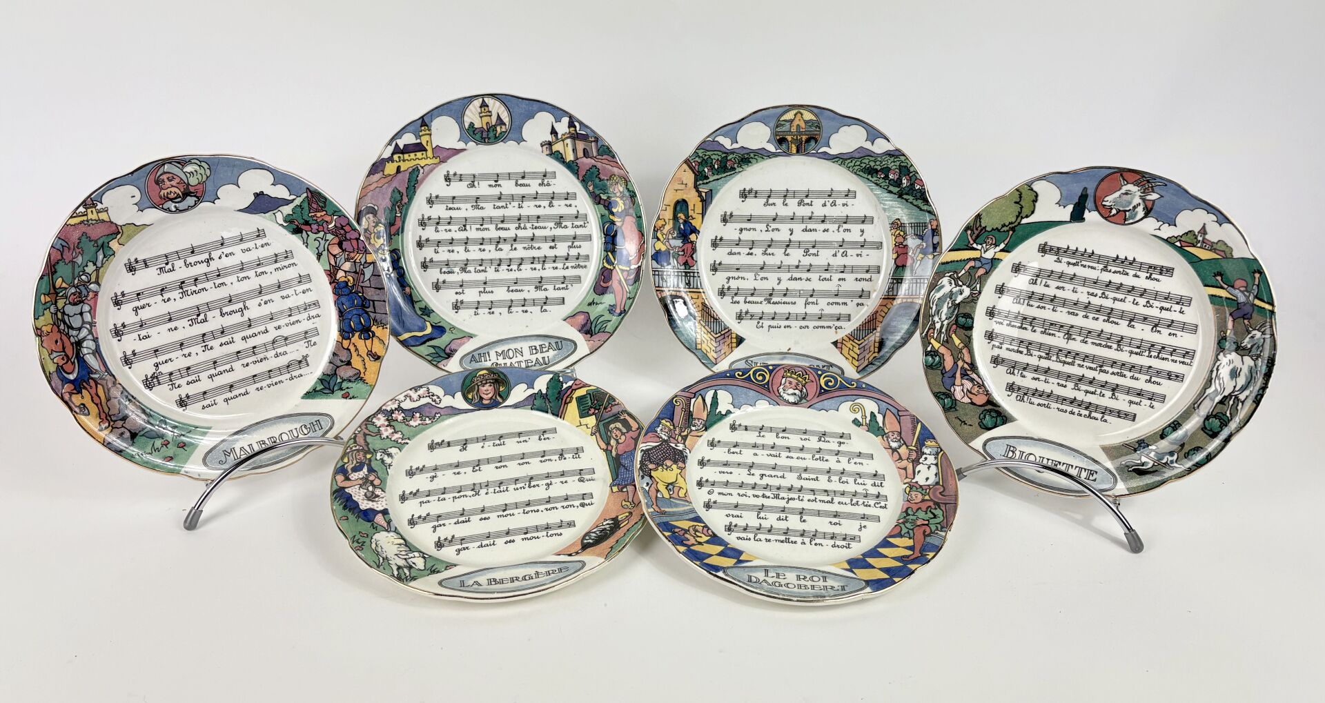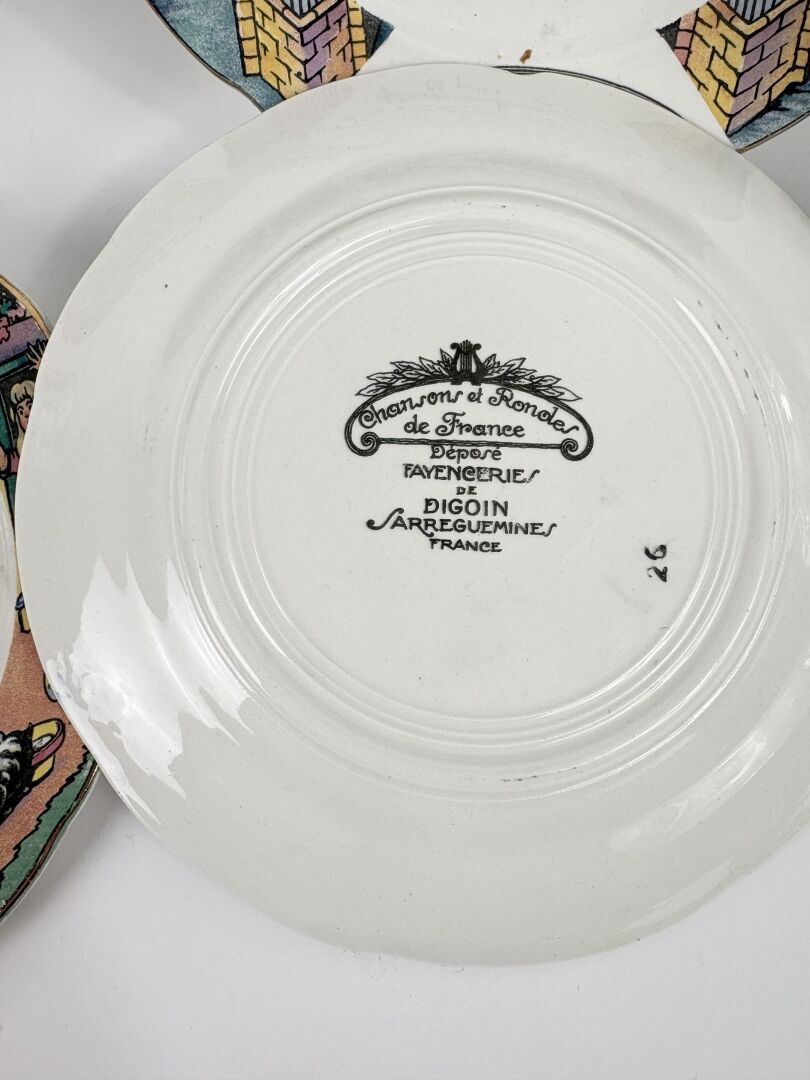 89,3 ESTIMATION: 30 / 50 € FAYENCERIES DE DIGOIN SARREGUEMINES Modèle Chansons et Rondes de France – Suite de 6 assiettes en faïence dont Le roi Dagobert, Au mon beau château, Biquette …