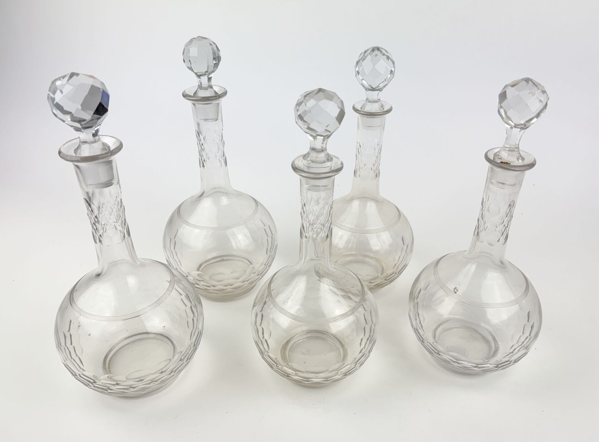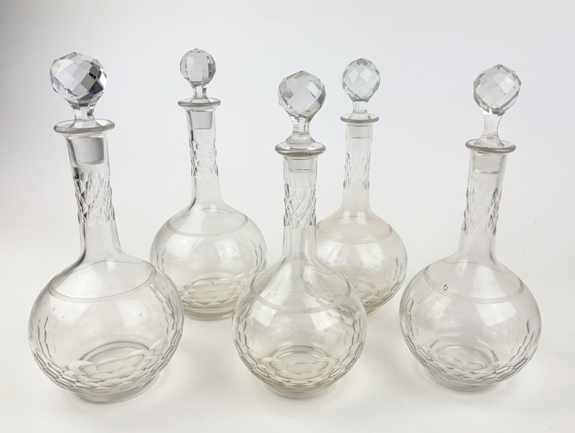 92 ESTIMATION: 80 / 120 € BACCARAT, attribué à Modèle Chauny – Suite de 2 carafes à vin rouge et 3 carafes à vin blanc en cristal taillé à motif nid d’abeille